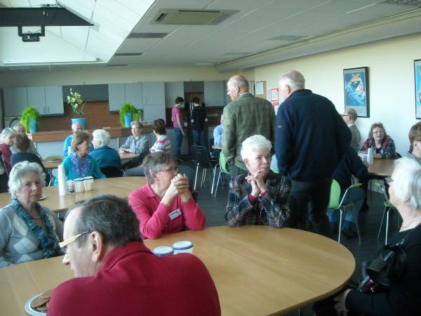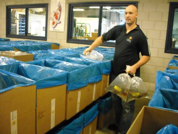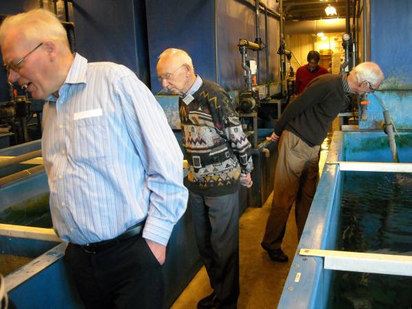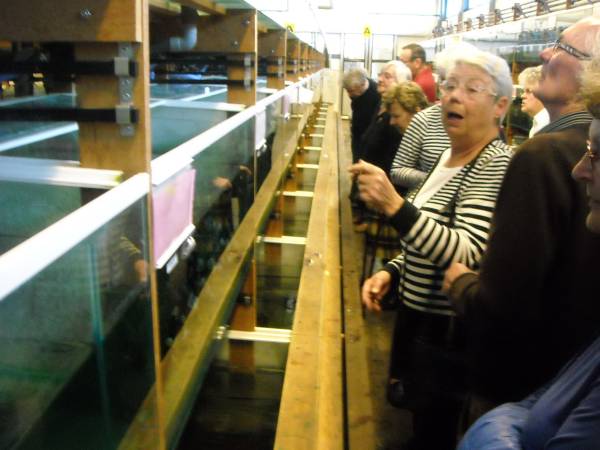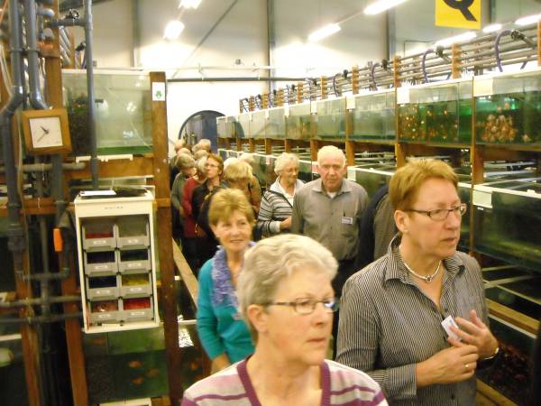 Geplaatst op:24-03-2011 Bijgewerkt op:24-03-2011 16:52 Bedrijfsbezoek Ruinemans in MontfoortBron: Nettie Kuijer, redactie Radio Stad MontfoortDonderdag 24 maart fietste een colonne K2Cérs naar Ruinemans Aquarium in Montfoort. Daar werden zij opgewacht door o.a. Frank de Goey, directielid van het bedrijf. Onder het genot van een kopje koffie en een stroopwafel luisterden de 64 gasten naar zijn uitleg over een van de grootste groothandelaren in levende vissen, die wereldwijd miljoenen vissen verkoopt. “Het is een kwetsbaar product,” aldus Frank. “We hebben 3000 aquaria met in totaal ruim 1.000.000 liter water. Er werkt 50 man personeel, 9 uur per dag, in wisseldiensten. Vier man zorgt voor de “probleembakken,” en twee dagen per week komt er een gespecialiseerde dierenarts langs.” “Wij zijn een doorgeefluik, een groothandel,” aldus Frank. “De hoofdmoot van de verkoop is in Nederland en België, maar we hebben klanten in meer dan 25 landen. Per dag worden er 3000 zakken vis verpakt en verstuurd.” Personeel “loopt een rijtje,” in een “inpakstraat,”en is niet alleen verantwoordelijk voor de juiste visvangst en verpakking, maar ook voor het welzijn van de vissen.Er wordt zo veel mogelijk energieneutraal gewerkt. Door warmtewisseling en hergebruik van het tot tropische temperaturen verwarmde water. ‘Zomers wordt er daardoor soms “0 gas” verbruikt..  |  | De bezoekers (“dit is een uitzondering, normaal komen hier alleen handelaren”) liepen door de lange gangen tussen de aquaria en verbaasden zich over de enorme aantallen, de schone bakken en de prachtige vissen. Het was warm, een tropische ervaring.
