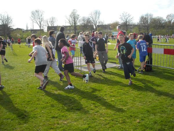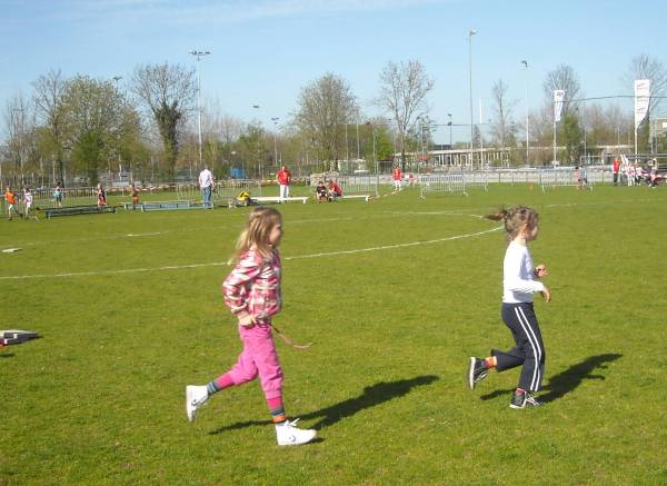 Het werd een echt feestje. Kinderen uit de bovenbouw  renden zo veel mogelijk rondes van 500 meter.