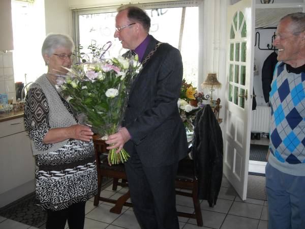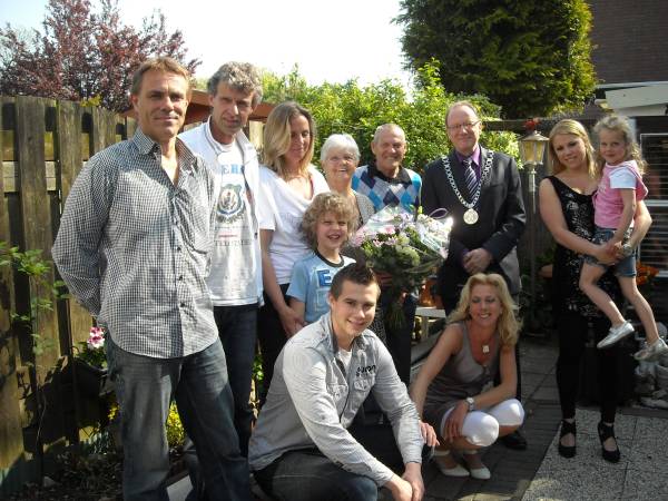 Geplaatst op:20-04-2011 Bijgewerkt op:20-04-2011 11:41 50 jaar in het huwelijksbootjeBron: Nettie Kuijer, redactie Radio Stad MontfoortBurgemeester Bert Jansen bracht woensdag 20 april een bezoek aan de heer en mevrouw van der Kant-Klaasen die op deze dag hun 50-jarig huwelijksfeest vieren. Tini Klaassen woonde, net als André van der Kant in de wijk Zuilen in Utrecht. André: “Zag ik ze voorbijlopen en vond het wel een leuke meid. Ik was een beetje een rock ‘n roll type, met een rolkuif. Ik voer op een sleepschip en leerde voor stuurman.” Ze vonden elkaar en na drie jaar verkering trouwden ze in het stadhuis in Utrecht, aan de Oude Gracht. André had nu alle mogelijke scheepvaartdiploma’s en kreeg een baan als stuurman aangeboden, mét een woning op een sleepschip. Ze voeren door Europa. Van Frankrijk tot Italië, van Duitsland tot Oostenrijk. Maar Tini zag het na een paar jaar niet meer zitten, al die vreemde talen, en wilde liever weer op de wal wonen. Na wat omzwervingen vond André werk aan wal, en kozen ze voor Montfoort, “Dat vonden we een leuke plaats.” Ze kregen een huis aan de Stadhouderslaan, waar ze nu al 33 jaar met plezier wonen. Tini bleef nog even werken bij de meubelfabriek in Waddinxveen, maar stopte toen de kinderen kwamen. Ze namen geen afscheid van het water. 20 Jaar lang hadden ze een kampeerplaats in Lexmond, waar het gezin, met kinderen en later de kleinkinderen, bijna alle weekenden in lente en zomer te vinden waren, met hun bootje. Later verlegden ze hun grenzen, en gingen met het hele gezin naar camping Gasparina in Peschiera, aan het Gardameer. Ze zijn dol op hun kinderen en kleinkinderen, waar Tini vaak oppast. “We gingen ieder weekend wel wat leuks doen, we hebben alle pretparken gezien.” Nu doen ze het wat rustiger aan. Tini maakt ‘s winters legpuzzels, ze computeren een beetje, en André wil graag weer gaan vissen als hij zijn nieuwe heup heeft. “Nee, ik mag ze niet doodmaken van mijn kleinzoon. Ik gooi ze allemaal weer terug.”  |  Ze vieren hun bruiloft met een etentje, rock ’n roll zit er nog even niet in. | | |