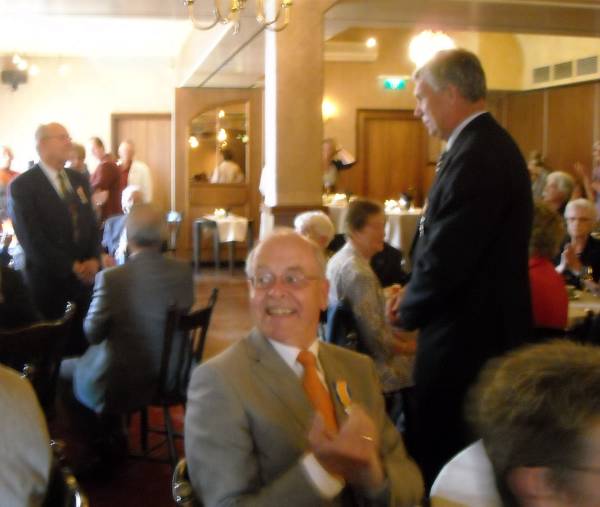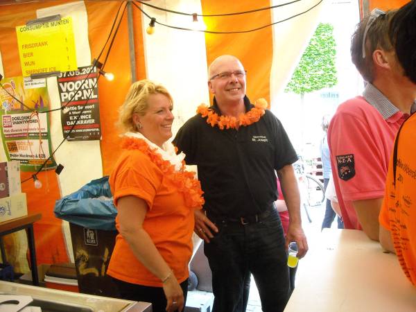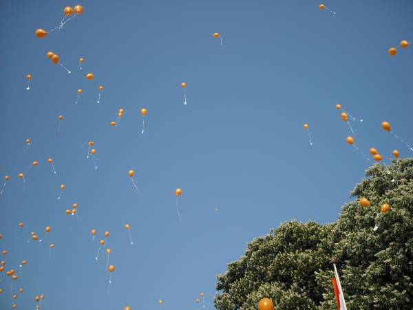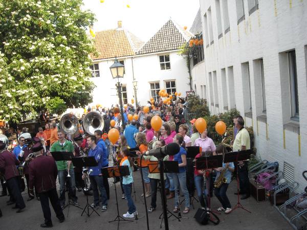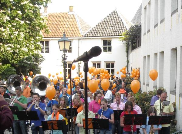 Oranje ballonnen en liedteksten werden uitgedeeld. Ons Genoegen en Carolus begeleide weer professioneel de bekende liederen, waarna de ballonnen losgelaten werden, op de wind richting Engeland.