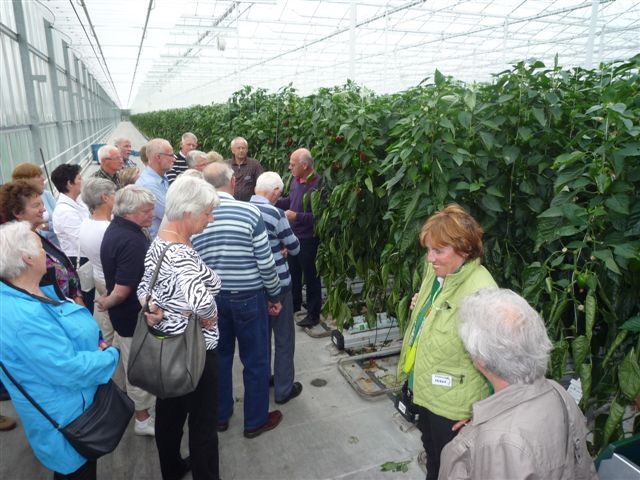 Na een uitgebreide bedrijfsinformatie door de heer van Dijk sr. was er een rondleiding door de kassen, waar de paprika's weelderig groeiden.