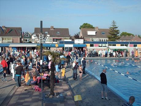 Het zwemseizoen is weer begonnen. Het zwembad in Montfoort bestaat dit jaar 50 jaar! Dit laten ze niet ongemerkt voorbijgaan. Een van de (jubileum) activiteiten is de Nationale zwem4daagse, die dit jaar voor de 36ste keer werd gehouden. De deelname viel iets tegen, vooral vanwege de slechte weersomstandigheden afgelopen maandag bij de start, maar … vrijdag waren de weergoden de zwemmers goed gezind en werd het een daverend slot, met o.a. een prachtige glijbaanrace. Er waren totaal 354 deelnemers, ongeveer 30 minder dan vorig jaar, waaronder 42 kinderen die deelnamen aan het waterfestijn omdat zij nog geen diploma hebben.