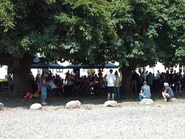 Terwijl de deelnemers onder de bomen van hun lunch genieten