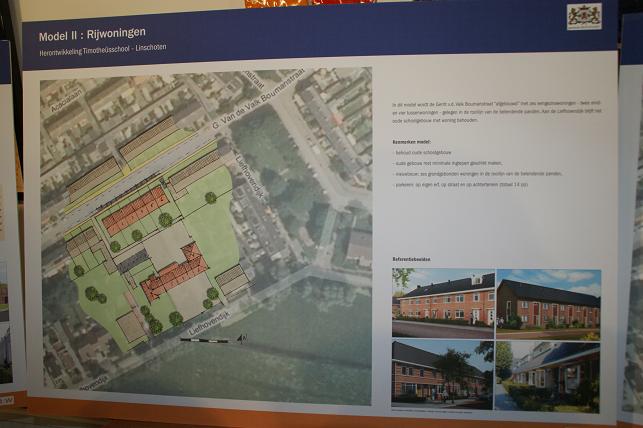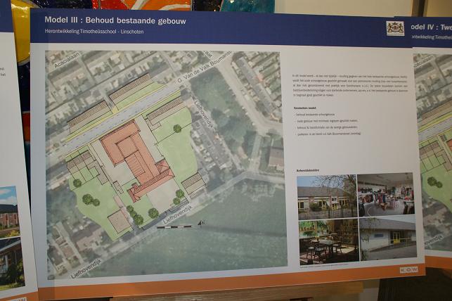 In totaal waren er ongeveer 60 inwoners aanwezig. Tijdens de avond zijn vier verschillende schetsontwerpen gepresenteerd door medewerkers van de gemeente en een stedenbouwkundige. Het voormalige gebouw van de Timotheüsschool is tot eind 2010 gebruikt voor onderwijs. Daarna is de school verhuisd naar De Brede Vaart in Linschoten en is het gebouw leeg komen te staan. Het gebouw en de grond zijn eigendom van de gemeente Montfoort. De school ligt aan de Liefhovendijk en kijkt aan de voorzijde uit over een restant stukje polderlandschap opgesloten tussen Linschoten en de M.A. Reinaldaweg. Het schoolgedeelte is in de loop der tijd uitgebreid tot aan de G. van de Valk Boumanstraat, waardoor het complex het woonblok in tweeën deelt. Zowel aan de linker- als aan de rechterzijde van de school staan particuliere woningen. Het gedeelte van het pand aan de Liefhovendijk is geschakeld aan de oude hoofdmeesterswoning.Tijdens de inloopavond zijn 4 ontwerpschetsen gepresenteerd. In alle schetsen wordt de oude dorpsschool aan de Liefhovendijk behouden. Het streven is dan ook deze plek een nieuwe functie te geven en als gemeentelijk monument te bestempelen. Voor het overige deel van de school zijn 4 ontwerpen: · Kangoeroewoningen (woningen die uit twee gedeelten bestaat: een gezinswoning en een één- of tweepersoonswoning, met elk zelfstandige voorzieningen) · Rijwoningen · Twee-onder-één-kap-woningen · Behoud bestaande pand
