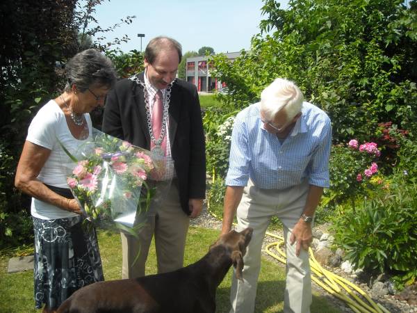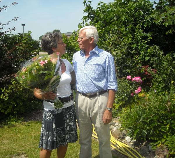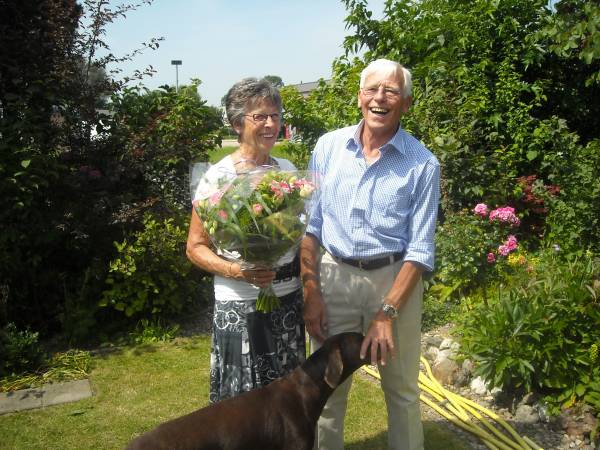 Natuurlijk moet de hond ook op de foto! | Ze leerden elkaar kennen via hun werk op de Kromhoutkazerne in Utrecht en betrokken een flat op Kanaleneiland. Daar werden hun kinderen, Lev en Marian geboren. Het gezin verhuisde naar de Anne Franklaan in Montfoort, waar het sportieve stel zich inzette voor de sportverenigingen. Riet speelde op hoog niveau volleybal, Joop was verbonden aan MSV, o.a. als wedstrijdsecretaris. Toen de jongste, Marian, naar school ging, nam Riet een baan aan in het Antoniushuis, en behaalde haar diploma als verzorgende. “Dat was iets anders als de kinderverzorging, of de tandartsassistente die ik voor mijn huwelijk was. Maar ik heb het 25 jaar met veel plezier gedaan. En nu zit ik in het bestuur van het Knooppunt, waar we regelmatig samenkomen om leuke activiteiten te bedenken.” Nu ze beiden gepensioneerd zijn blijven ze sportief bezig. Joop met duurloop, en Riet met lange wandelingen met de hond. Ze genieten van kampeerreisjes naar bergachtige landen als Frankrijk, Spanje en Zwitserland, en bedwingen daar met hun hond vele bergen.
