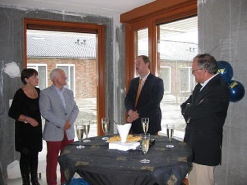 Geplaatst op:18-07-2011 Bijgewerkt op:18-07-2011 09:59 Hofland-Oost fase 4, 5 & 6Bron: gemeente MontfoortFeestelijke opening recreatieruimte Hofland-Oost fase 4 Op donderdagmiddag 14 juli was de feestelijke opening van de recreatieruimte in Hofland-Oost fase 4. Wethouder Jonkers (Montfoort), de heer Korzelius (SWW) en de heer Wils (voorzitter Groepswonen Senioren Montfoort) hebben gezamenlijk het symbolische lintje doorgeknipt. Hiermee is een nieuwe mijlpaal bereikt binnen het project Hofland-Oost. De middag is geïnitieerd en georganiseerd door SWW. Eind juni is al bekend geworden dat SWW alle 32 koopwoningen in Hofland-Oost fase 4 en 5 heeft verkocht. Hofland-Oost fase 4 biedt veertien hofwoningen voor 55-plussers, die na afgelopen donderdag allemaal zijn opgeleverd. Het concept, een bijzondere manier van groepswonen voor 55-plussers, is nieuw in Montfoort. Gezamenlijke hebben gemeente Montfoort, SWW en GWSM de afgelopen jaren gewerkt aan de totstandkoming. Hofland-Oost fase 4 biedt zowel koop- als huurwoningen. De koopwoningen zijn aangeboden onder Koopgarantvoorwaarden. Wethouder Jonkers, het echtpaar Wils en de Hr. Korzelius in de recreatieruimte