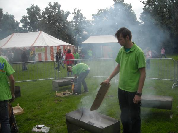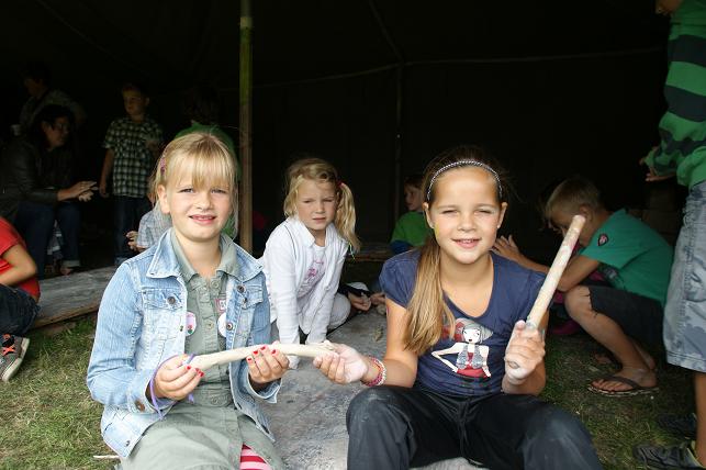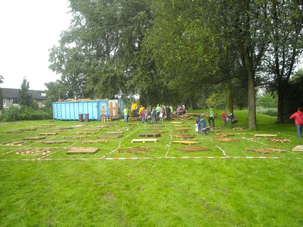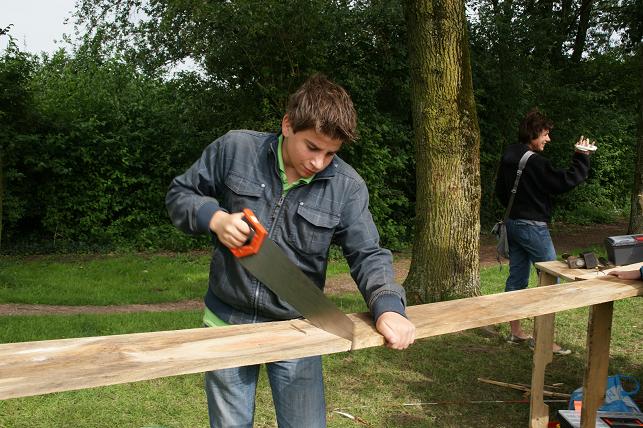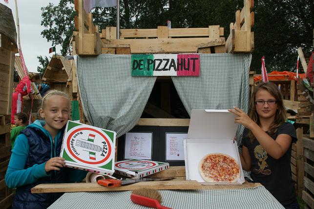De ene na de andere plank werd op maat gezaagd. |  |  Lekkere broodjes bakken. |  |  In de tenten werd er gekleurd en geknipt maar de jeugd kon ook kleien. |  |  Deze dames hadden een prachtige pizzahut gebouwd. |  Nog even de hut waterdicht maken. |
