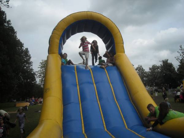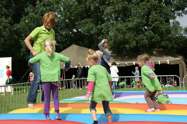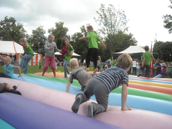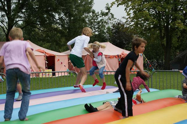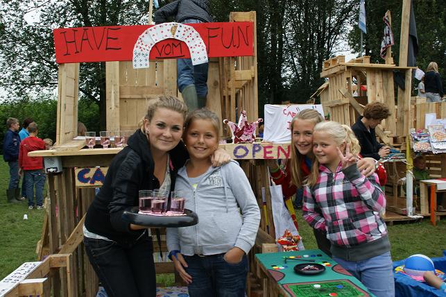 |  |  |  |  De kinderen en begeleiders van de kinderopvang leefden zich uit op het springluchtkussen. |  Met z'n drieën de zelfgemaakte hut bekijken. |  De jongens hadden hun hut omgedoopt tot 'De VOM Hut'. |  |  |  | Een echt casino met drankjes en roulette.