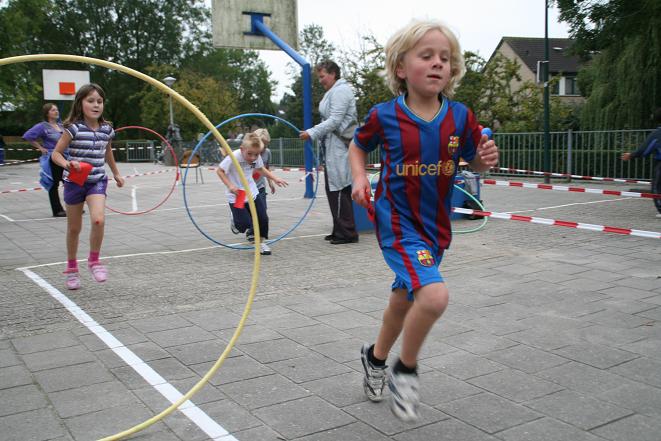 De kinderen legden een parcours af door de Olympische ringen heen en onder de Olympische vlag door.