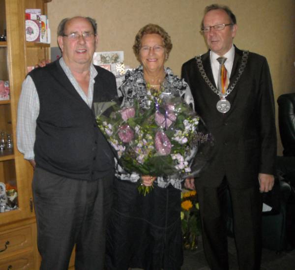 Geplaatst op:12-10-2011 Bijgewerkt op:13-10-2011 11:47 Gouden bruidspaarBron: Nettie Kuijer, redactie Radio Stad MontfoortWoensdag 12 oktober bracht Burgemeester Jansen een bezoek aan de heer en mevrouw Van Galen-Verkleij die in Montfoort hun 50-jarig huwelijksfeest vierden. Het gouden bruidspaar leerde elkaar kennen doordat de broer van Gerrie, Anton, bevriend was met Wim. Ze gingen gezellig dansen in Woerden, en of de vlam nu daar oversloeg of thuis, ze kregen stevig verkering. Gerrie werkte met veel plezier als filiaalhoudster in een kousenzaak in Hoograven, maar werd, zoals gewoon was in die jaren, ontslagen in 1961 toen ze trouwde. Op zijn 17e was Wim vanuit Haarzuilen naar Montfoort vertrokken. Waar hij werkte op de vuilnisstort in Mastwijk, waarbij de schuit soms gebruikt werd als ijsbreker. Later verlegde hij zijn werkzaamheden wat hoger: in een kraan op 20 meter boven de containers in Rijnmond. Samen genoten ze van de carnavalsperiode, waarbij Gerrie zelfs prinses carnaval was bij club ’75 in Achthoven. Gerrie mag graag bridgen, en geeft daarbij ook leiding aan de bridgegroep van zo’n 60 man. Wim biljart met veel plezier bij Kasteelzicht., waar beiden graag geziene gasten zijn bij de klaverjaswedstrijden en bijeenkomsten. 5 kinderen en 9 kleinkinderen geven veel plezier én werk. Er werd meegebouwd aan hun huizen toen de kinderen op zichzelf gingen wonen. Samen fietsen en wandelen ze heel wat kilometers, thuis en in de vakantie “Hoewel, we hebben nu altijd vakantie,” gniffelt Gerrie.