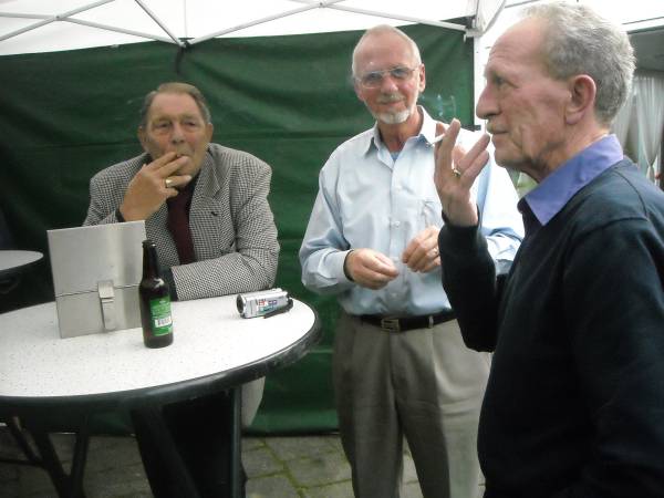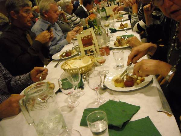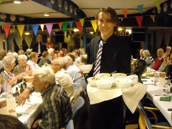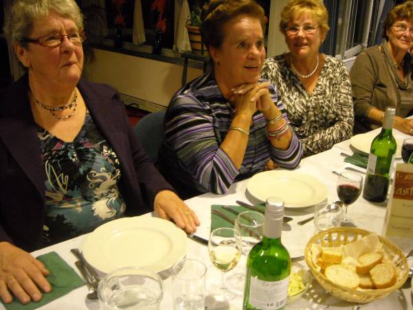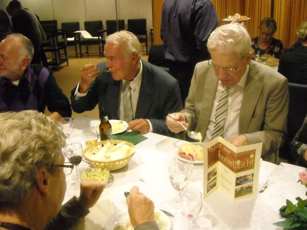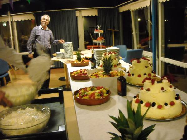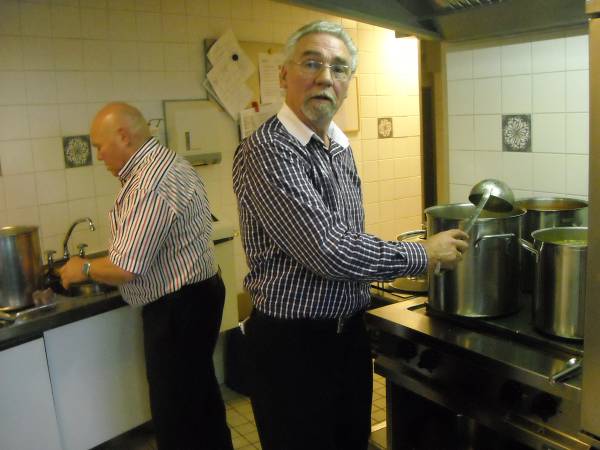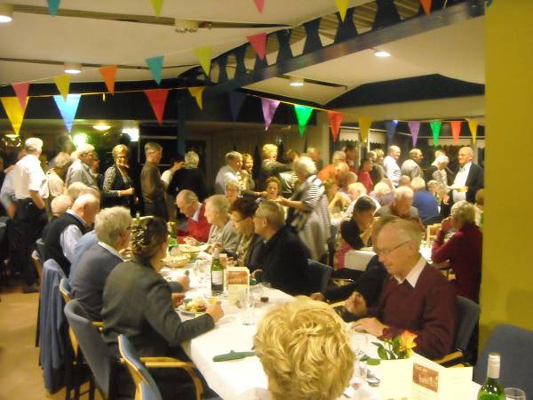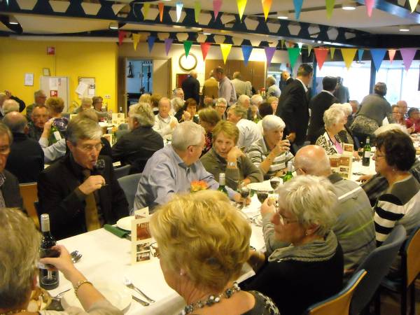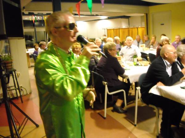 Geplaatst op:29-10-2011 Bijgewerkt op:30-10-2011 10:06 40 jarig jubileum biljartvereniging Kasteelzicht in MontfoortBron: Nettie Kuijer, redactie RSMVrijdag 28 oktober werd de zaal in Antoniushof gevuld door leden van de jubilerende biljartvereniging Kasteelzicht. Zo’n 185 gasten schoven aan de gezellig gedekte tafels (Piet: “Ze zeiden dat past niet, maar natuurlijk paste het wel”) De feestcommissie had zich ingezet om er een mooi feest van te maken. Niet alleen de biljarters en hun dames waren uitgenodigd, de biljartvereniging heeft de mooie traditie dat ook de weduwen van biljarters worden uitgenodigd voor bijzondere dagen. (weduwnaren zijn er niet, daar de biljartvereniging exclusief voor mannen is)  Keukenprinsen | Er werd een copieus diner geserveerd, met vers gemaakte huzarensalade, soep, varkensmedaillon met pancetta en saus van paddenstoelen, aardappelgratin, stoofpeertjes en ijsvariatie. Daar moet een enorme berg werk in hebben gezeten, Piet en zijn team: een grote pluim!  De rooktent buiten | Ook de entertainment was prima verzorgd: Ries de Mooi trad op al DJ en bracht hilarische en ook goed gezongen live acts, gevolgd door Kees van de Berg met zijn meezingers.  Ries de Mooy |  Nu nog lege borden |  Varkensmedallionmet heerlijke saus en extra's |  Extra hulp van Ekelschot |  Aanvalluh! |  |  Nee, dit is geen polonaise, dit is de rij voor het ijs |  En toen was het stil in de zaal | |