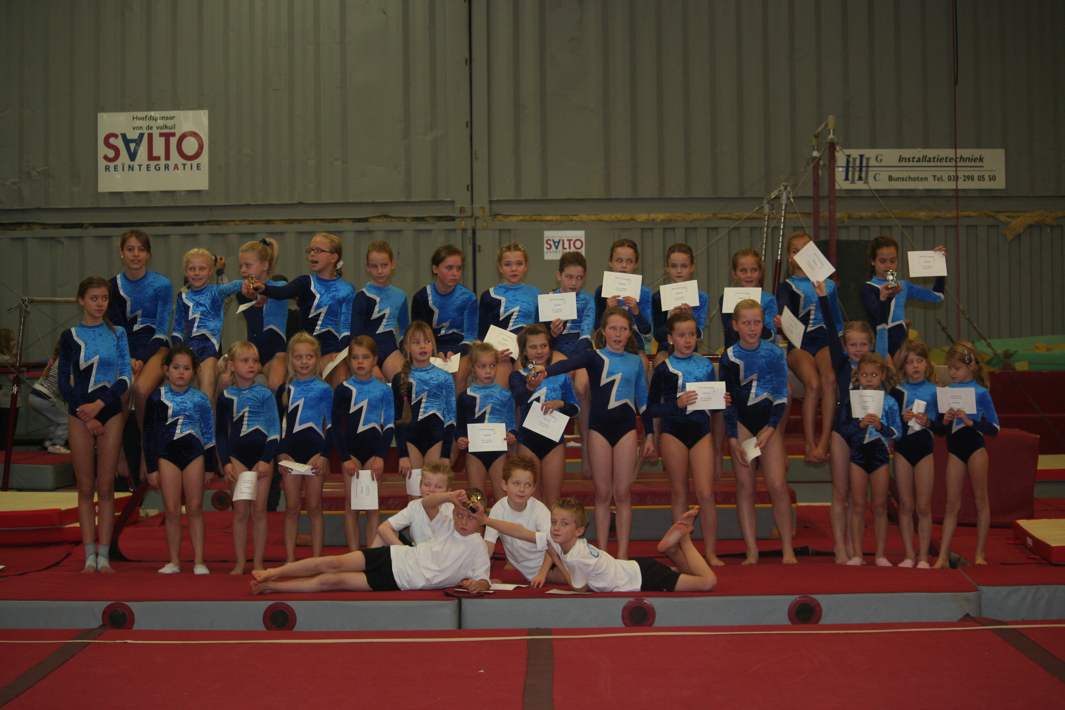 Geplaatst op:13-11-2011 Bijgewerkt op:13-11-2011 12:31 Gymnastiekvereniging ONI Montfoort succesvol op mini ¾ kampBron: Anchel KraanZaterdag 12 november 2011 vond de allereerste wedstrijd van het seizoen plaats, namelijk de mini ¾ kamp in Hooglanderveen. Een mini ¾ kamp wordt geturnd in groepen van 6 turners of turnsters op 3 of 4 toestellen. Het groepstotaal telt als einduitslag. Gymnastiekvereniging ONI Montfoort deed mee met wel 6 groepen, waarvan 1 jongensgroep. Het werd een succesvolle ochtend, want maar liefst 4 bekers gingen mee naar huis. 3-kamp ONI2: Senna Kraan, Janneke Scholman, Milou Huizenga, Chenna Vianen en Amber Jansen turnden een geweldige wedstrijd en werden 2e met een puntentotaal van 126,50. Ze mochten een prachtige beker mee naar huis nemen. ONI3: Michelle de Ruijter, Eefje Wigbers, Melanie van den Berg, Isabel Vendrig, Nienke Nijman en Danique van Leeuwen verzamelden met z’n allen 123,10 punten bij elkaar en ook zij mochten de 2e prijs in ontvangst nemen. ONI6: Guus Hoogland, Jorn Goersen, Daan Braams en Quiten Kamer deden allemaal voor het eerst keer mee aan een officiële wedstrijd. Met 89,50 punten waren zij de succesvolste jongensgroep en daarmee verdiende zij de 1e plaats!. 4-kamp ONI4: Anouk de Reuver, Esmee van der Lingen, Isa Kamer, Nadine en Julie de Vries en Amy van Vliet mochten ook op het podium komen om de 1e prijs in ontvangst te nemen. Zij turnden maar liefst 166,50 punten bij elkaar! ONI1: Maud Vreeswijk, Roos Guichelaar, Daisy van den Hazelkamp, Iva van West, Luna van den Berg en Resa Jansen turnden een hele goede eerste wedstrijd. Ze werden 6e met een puntentotaal van 115,10. Ook ONI5: Michelle den Hartog, Iris Dorrestein, Gwen Breuer, Romy van den Pol en Dionne van Lint vielen net buiten de prijzen, ondanks de hele goede prestaties. Alle deelnemers waren aan elkaar gewaagd waardoor het verschil in punten erg klein was. Zij turnden maar liefst 166,5 punten bij elkaar. Volgende week starten de selectieturnsters (divisie 4 en 5) met de 1e rayon wedstrijd in Hooglanderveen.