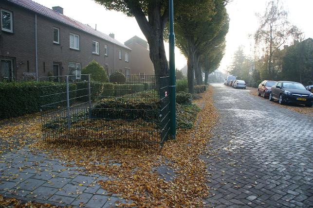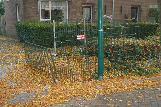 Ook in Linschoten worden de inwoners aangespoord om het blad in hun straat bij elkaar te vegen en te verzamelen in zo'n speciale draadkooi.