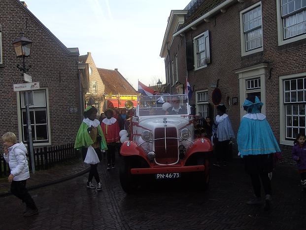 De pieten rijden mee met de 'oude spuit'.