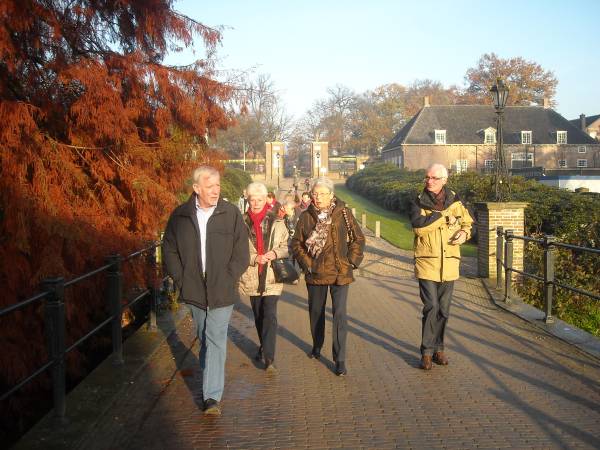 De gouden herfstkleuren van de bossen kleurden prachtig in het zonlicht. In de folkloristische paardenstallen van Kasteel Amerongen nestelden de gasten zich om te genieten van koffie met appeltaart. Daarna volgde wandelingen door de prachtige tuinen en het kasteel. De sfeer van vroeger werd met een filmbeeldenserie door het hele kasteel benadrukt.