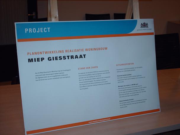 Geplaatst op:22-11-2011 Bijgewerkt op:22-11-2011 20:38 Inloopavond Miep GiesstraatBron: redactie RSM Aad van der VeenAlles stond op borden duidelijk weergegeven Op een redelijk goed bezochte inloopavond werden op 22 november de 3 opties voor nieuwbouw op de Miep Giesstraat door het college gepresenteerd. De 3 opties waren met name de wijze waarop de 3 starters + woningen en de 2 vrijstaande huizen worden gesitueerd. Nadat het ontwerp 7 x door zowel bewoners of raad naar de prullenbak werd verwezen, hoopt wethouder Jonkers dat dit project, wat geheel door de gemeente wordt gedaan, wel succesvol verloopt. Hij hoopt tevens dat het bouwen kan gebeuren door één of meerdere Montfoortse aannemers, uiteraard in een samenwerkingsverband. Nog even kijken naar de oude / huidige situatie Nadat de reacties van de inwoners zijn geïnventariseerd, worden de plannen verder uitgewerkt. Medio februari kan het in de raad worden besproken en na goedkeuring gestart worden met het gehele verdere traject. Om daarna te discussieren over de 3 nieuwe opties