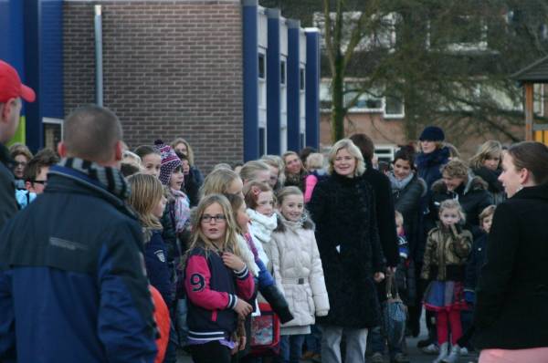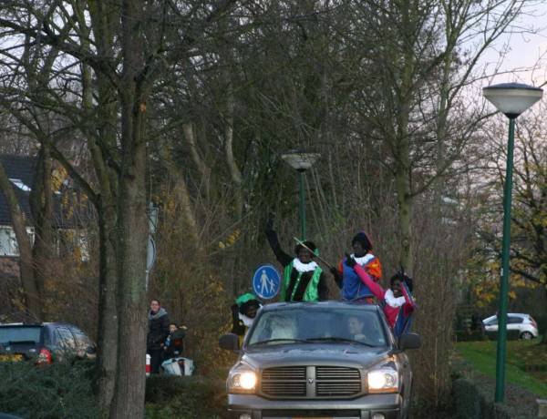 Spanning op de gezichten van de leerlingen. Zou hij komen ? En ja hoor ..... daar komt in de verte iets aan. Een hele grote auto met allemaal Pieten en wie zit er achter de voorruit. Gelukkig .... Sinterklaas.