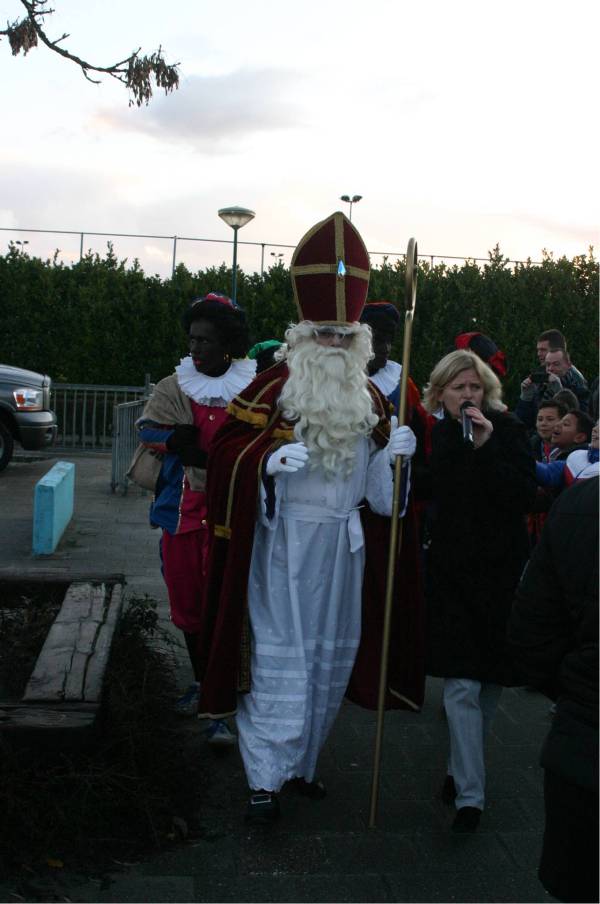 Sinterklaas wordt welkom geheten door directrice Hanneke Mulder. En hoewel er hele donkere wolken aan de lucht zijn ... het is droog, zodat Sint ook buiten nog even een praatje kan maken.