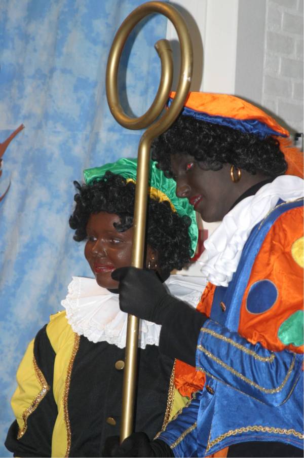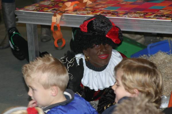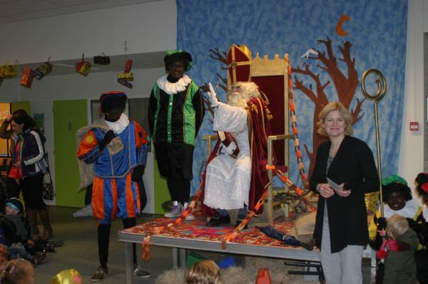 En dan snel naar binnen waar een hele mooie stoel voor de Sint klaarstaat. De kinderen hebben al wekenlang naar dit feest toegeleefd en ook de Pieten hadden wat bedacht om op dit feest te laten zien. Zo was er een Piet die kon jongleren en de anderen maakten allemaal grapjes. Sommigen kropen zelfs weg onder het podium.