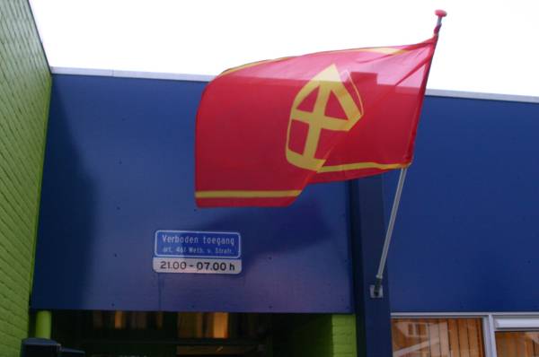 De Sinterklaas-vlag hangt uit, zodat Sint weet dat ook hier zijn verjaardag wordt gevierd en dat het bordje Verboden toegang boven de schooldeur niet voor hem en zijn Pieten is bedoeld. De goedheiligman is meer dan welkom.