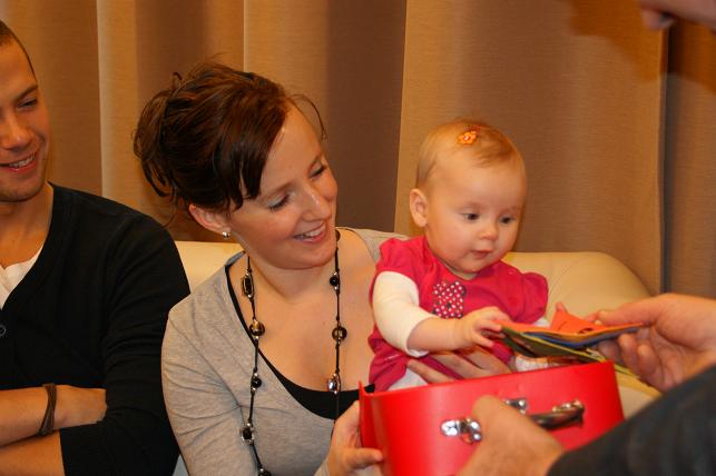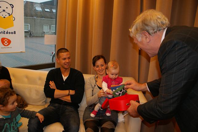 Wethouder Vlaar overhandigde het eerste BoekStartkoffertje aan de op 3 juli 2011 geboren Lisa Langerak en haar ouders Ivan en Esther Langerak.