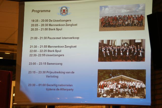 De koren die optraden waren Shantykoor De IJsselzangers uit Montfoort, en de koren Mannenkoor Zanglust en Zangkoor Sterk Spul uit Linschoten.