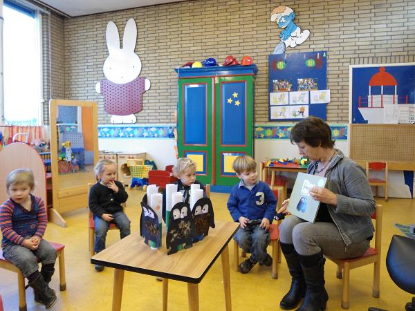 Met veel aandacht luisteren de peuters naar het verhaal van een klein uiltje dat zijn mama kwijt is.