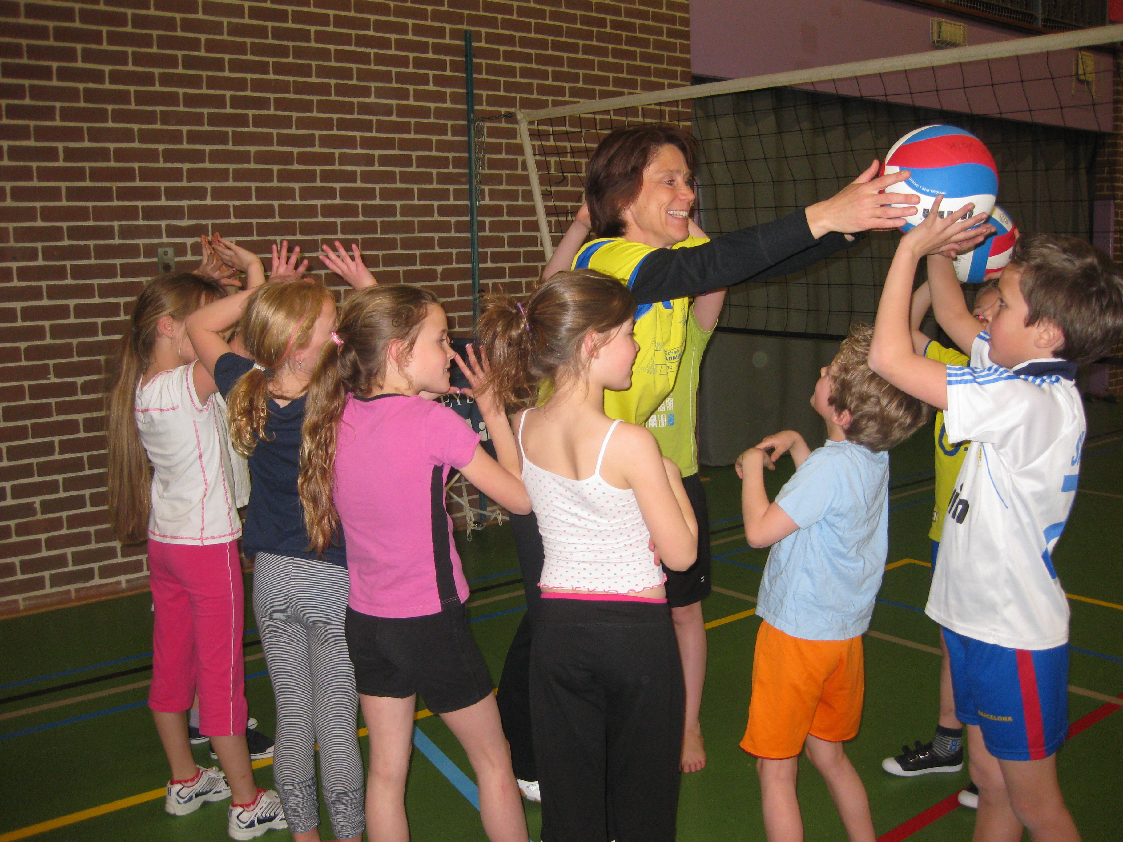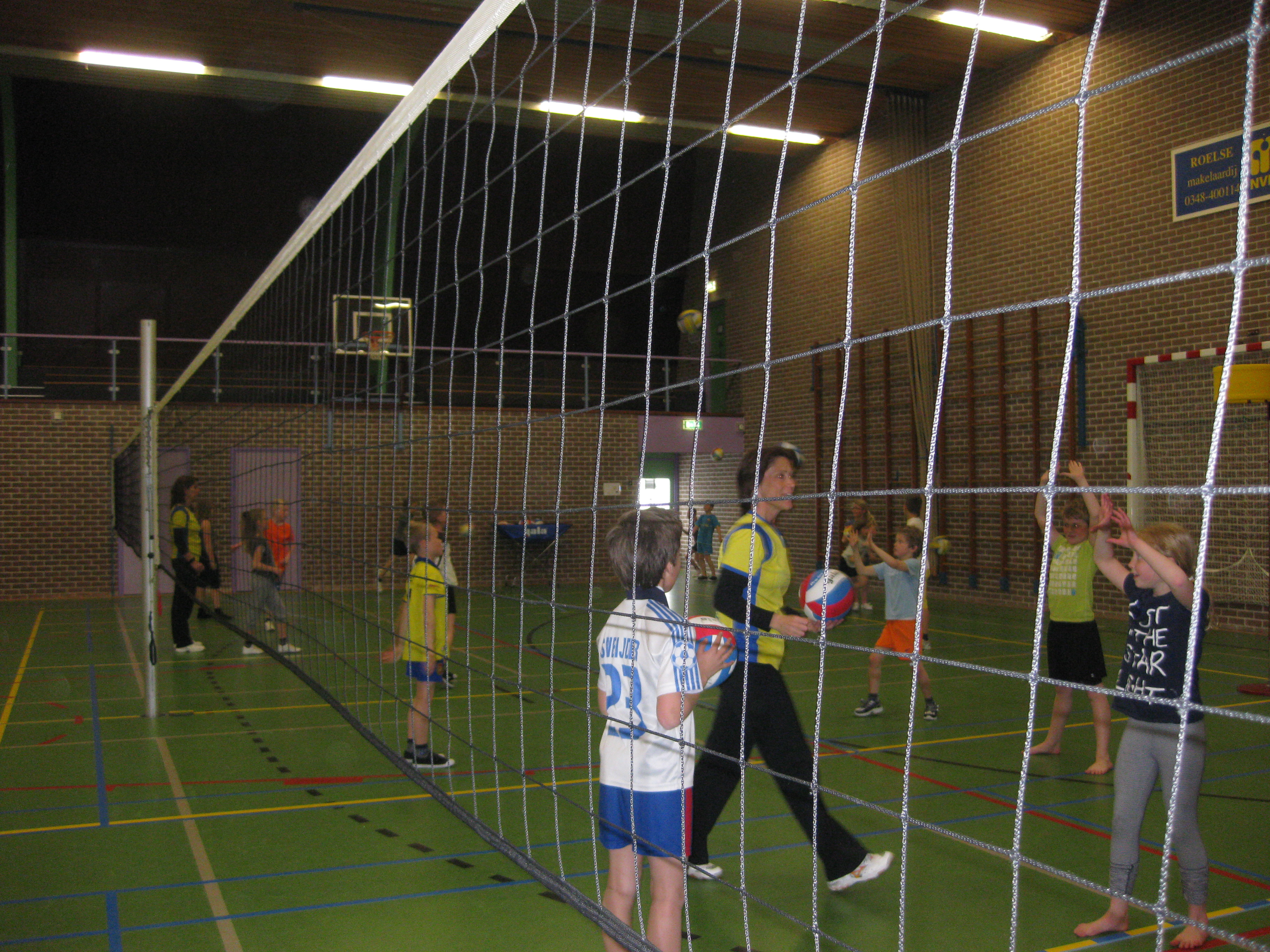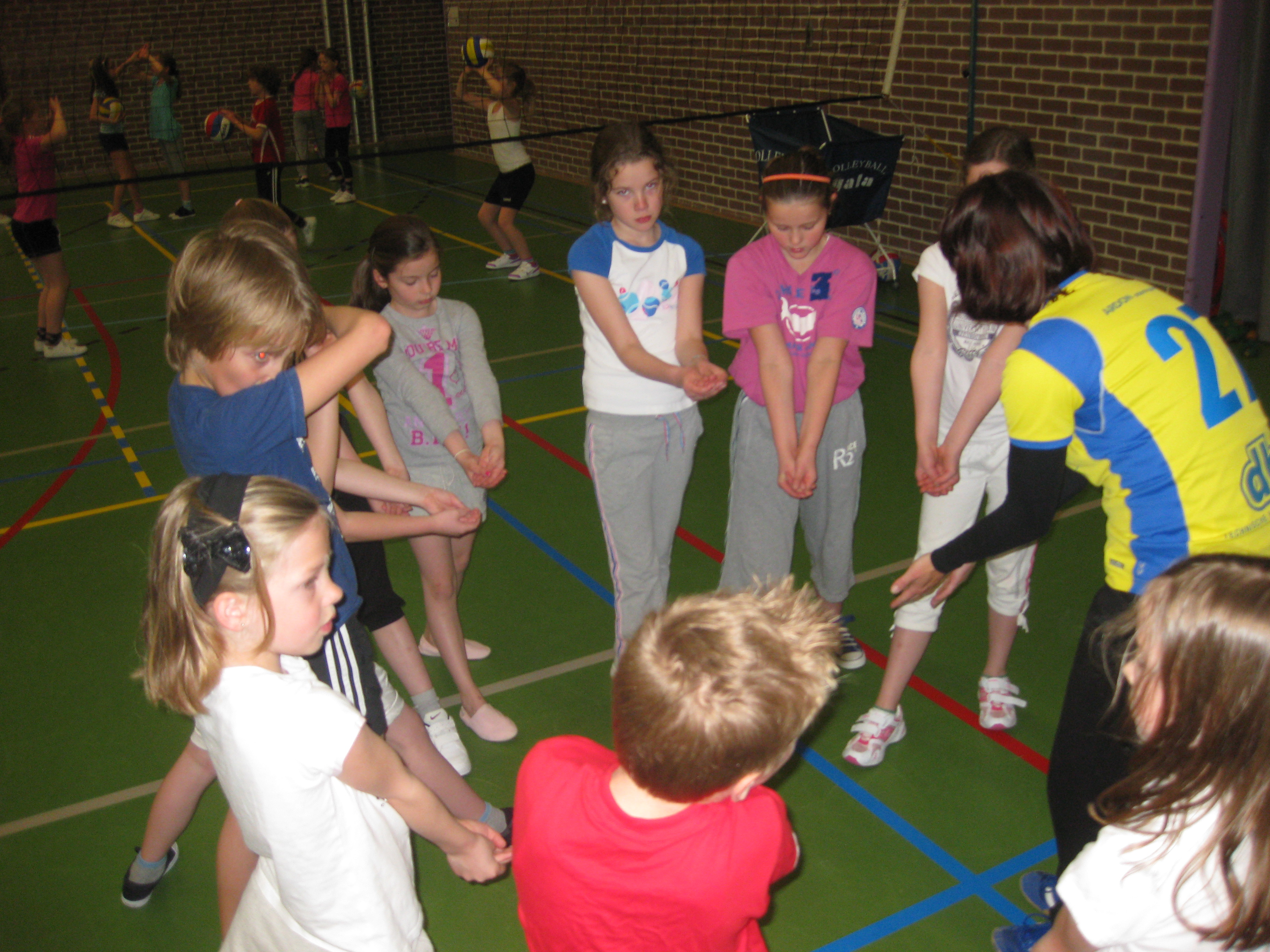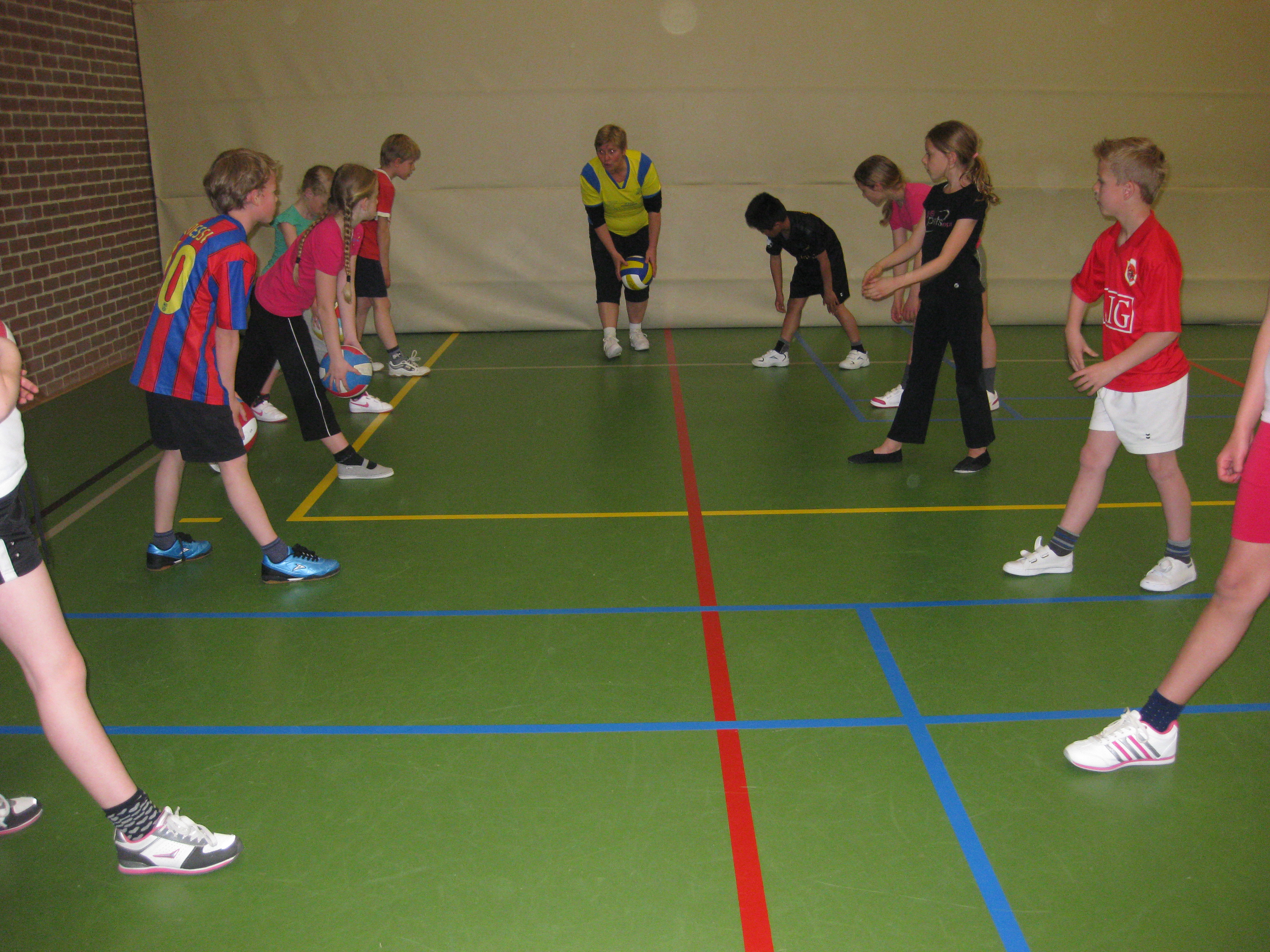 Zeven dames van De Valk hebben deze dag verzorgd. Na een kort inleidend praatje begonnen de kinderen met een soort tikkertje als warming up, het zogenaamde Jagerspel. Vervolgens ging de groep in drieën uiteen en kregen alle kinderen in korte tijd de mogelijkheid om kennis te maken met het serveren, de onderarmse techniek en de bovenhandse techniek. Zeker geen makkelijke activiteit want het is een technisch moeilijke balsport en voor de meeste leerlingen was het een eerste kennismaking met deze tak van sport.