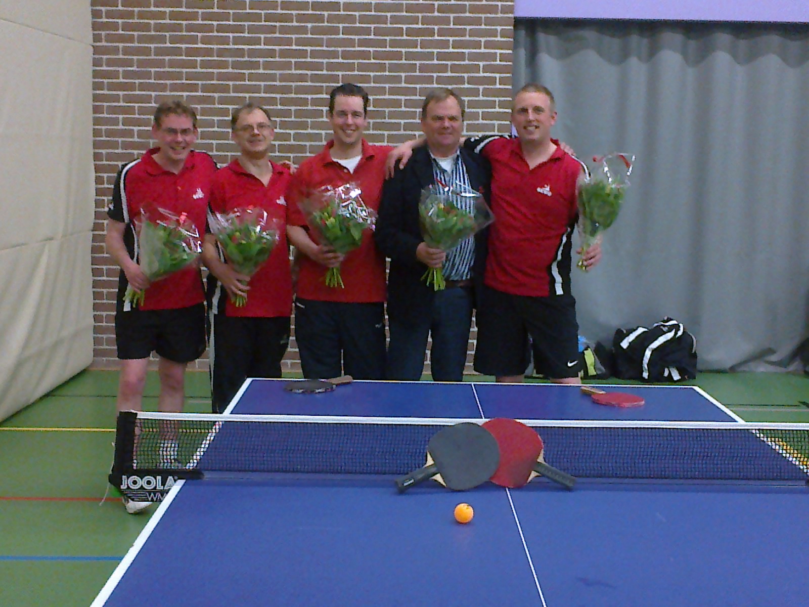 Geplaatst op:24-04-2012 Bijgewerkt op:24-04-2012 18:26 De Schans 2 en 4 KampioenBron: Wim KokOp de laatste dag van de voorjaarcompetitie hebben zowel team 2 en 4 van tafeltennisvereniging De Schans de kampioenstitel binnen gehaald. Afgelopen donderdag werden de leden van beide teams met een bloemetje vereerd. Ze zijn in het zonnetje gezet door de wedstrijdsecretaris Henny van den Haselkamp. Het behalen van het kampioenschap was mede afhankelijk van de resultaten van de directe tegenstanders. De Schans 2 moest in de laatste wedstrijd tegen HTTC 5 tenminste een score behalen van 6-4 om het kampioenschap naar zich toe te trekken. Het team liet dit echter niet op deze stand aankomen en versloeg de tegenstander met maar liefst 9-1. Het team van De Schans 4 had op 2 april zijn laatste wedstrijd gespeeld en was, om kampioen te worden geheel afhankelijk van wat het team van Vita 2 in haar laatste wedstrijd zou presteren.. Vita 2 zou dan tenminste met 9 – 1 moeten winnen. Het werd echter 6-4, waarna de Schans 4 uiteindelijk de kampioensvlag kon hijsen.  Team 2 v.l.n.r.: Henk van de Sluijs, Jos van Kortenhof, Tom Oostrom, Frank Sangers