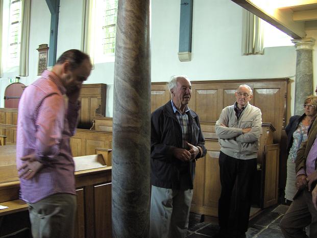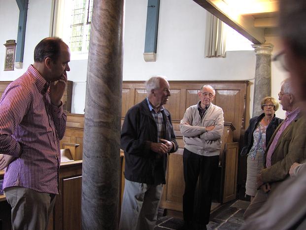 Hij leidde de vrijwilligers door de kerk en liet hen bijzondere kenmerken van de kerk zien waaronder het interieur van eikenhout. Ook de opening in de buitenmuur kwam ter sprake. Officieel heet zo’n opening hagioscoop. Daar konden de mensen die de kerk niet in mochten, door bijvoorbeeld een bemettelijke ziekte, toch het altaar zien.
