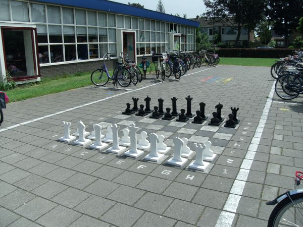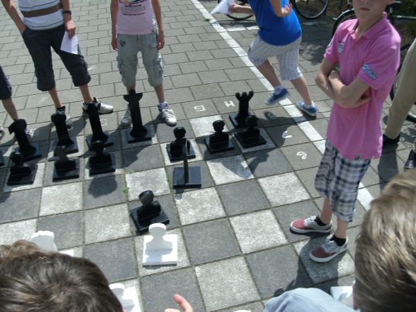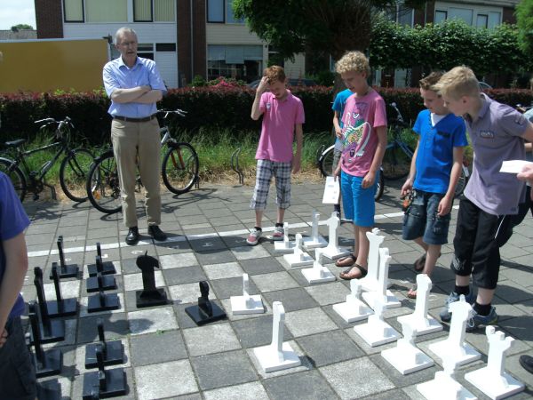 Na vele weken oefening was het vrijdagmiddag zover. In de stralende zon speelden twee groepen leerlingen een wedstrijd onder leiding van Piet Boere en Kees van Rooijen die ook de schaaklessen hebben verzorgd.
