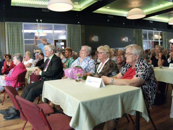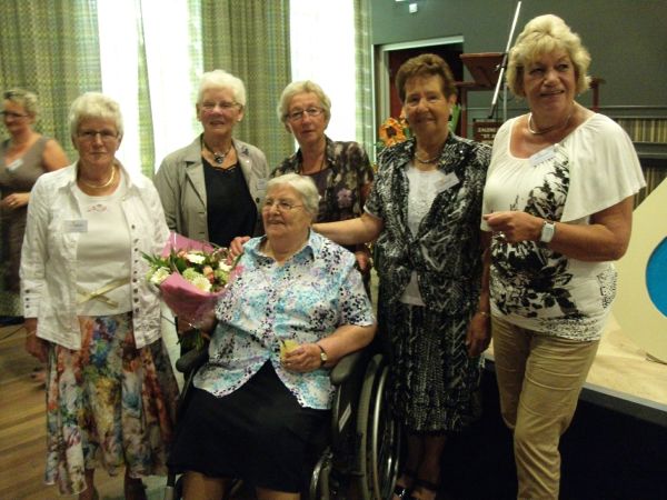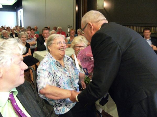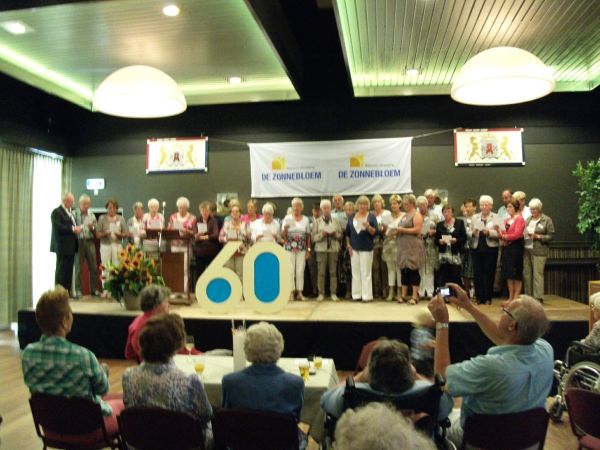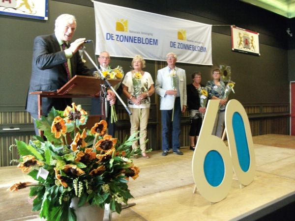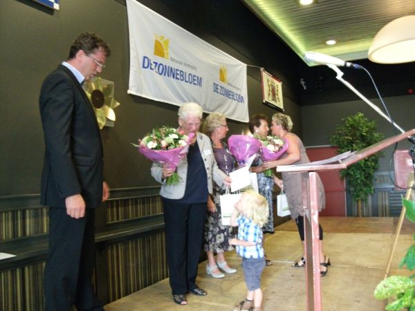 Geplaatst op:07-09-2012 Bijgewerkt op:09-09-2012 07:23 Feestelijke viering 60 jarig jubileum Zonnebloem afdeling MontfoortBron: Nettie Kuijer, redactie RSMDe afdeling van de Zonnebloem Montfoort-Linschoten pakte groots uit vrijdag 7 september bij de viering van hun 60-jarige bestaan. De feestcommissie, bestaande uit Marry van Dyk, Gusta van Hienen, Sjef klarenbeek, Ria Spruit en Astrid van de Wijngaard maakten er een groot feest van in het Sint Joseph.  |  Wethouder Vlaar brengt een hulde aan het bestuur en de vrijwilligers d.m.v. een Zonnebloem. |  | De vrijwilligers zorgden, samen met de mensen van Sint Joseph, voor koffie met gebak en een heerlijke lunch.  Bep van Nimwegen, medeoprichtster afd. Montfoort | Jubilarissen rond Bep van Nimwegen, een van de oprichters. |  | Patrick van de Brink, provinciaal voorzitter van Utrecht en Sjef Klarenbeek, voorzitter van afdeling Montfoort, reikte diverse gouden Zonnebloemspelden uit aan bestuursleden en jubilarissen. Alle vrijwilligers zongen samen het “Zonnebloemlied.”  Het Utrechtse politiekoor gaf een fraai optreden | | | | | |