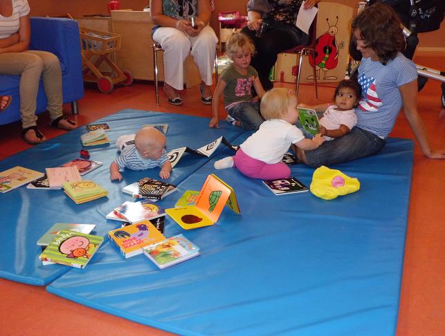 De ouders en medewerkers van het kinderdagverblijf kregen hierover een film te zien, en de boekjes die geschikt zijn voor baby`s vanaf 3 maanden.