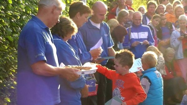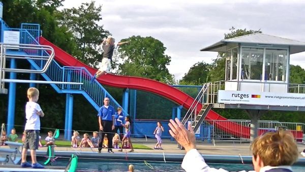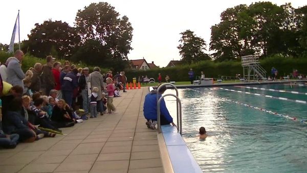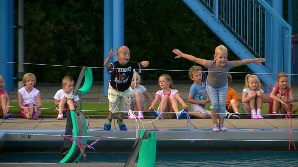Geplaatst op:15-09-2012 Bijgewerkt op:15-09-2012 08:15 43 Bikkels halen hun zwemdiplomaBron: Nettie Kuijer, redactie RSMVrijdag 14 september stonden 43 kinderen op het grasveld van het Knopenbad in Montfoort te wachten om zich, vanaf de 2.5 meter hoge duikplank, gekleed in het water te storten. Bewonderd door honderden familieleden en vriendjes durfden de jonge kinderen, vanaf vijf jaar(!) de diepe sprong te maken. De een nonchalant, de ander gedurfd met een opsprong, soms even geholpen, en allemaal met een forse plons. Met een grijns bovenkomend gingen ze verder: 12,5 meter rugslag, 12,5 meter schoolslag en 1 minuut watertrappen met vrije armhouding. In badkleding gingen de bikkels weer te water voor 75 meter schoolslag en 50 meter rugslag. Opmerkelijk was de ontspannen houding waarin de kinderen op hun rug de banen maakten. Telden ze hardop tot tien? Alle 43 behaalden hun zwemdiploma A. Respect voor het fantastische team van het Knopenbad dat deze jeugd in amper 4,5 maand zo goed leerde zwemmen!