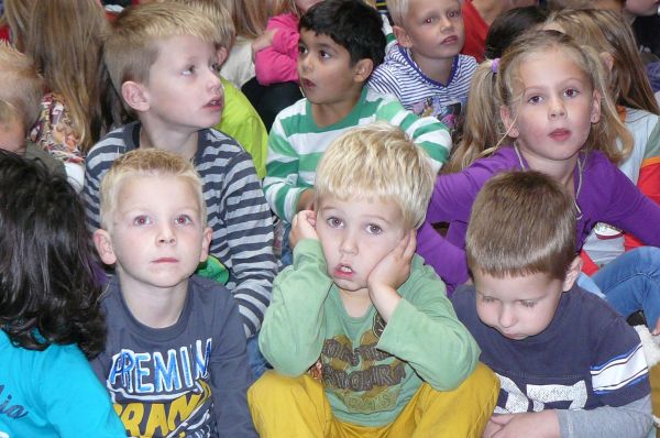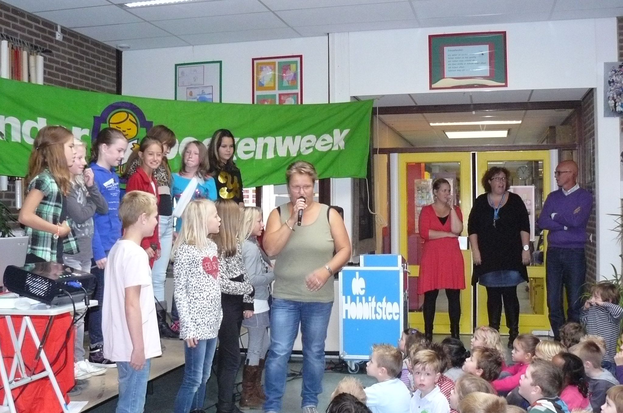 De Hobbitstee heeft afgelopen woensdag met alle kinderen van de school de kinderboekenweek geopend. Dit jaar is het thema: "Hallo Wereld".  Door een toneelstuk van twee leerkrachten werd ontdekt dat je de wereld kunt ontdekken door vragen te stellen, een andere taal te leren en door te fantaseren. Ook ontdekten ze dat iedereen op zijn eigen wijze van iemand houdt.