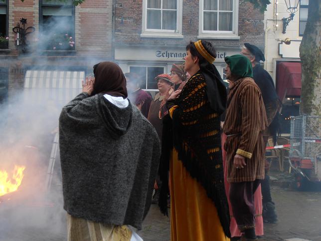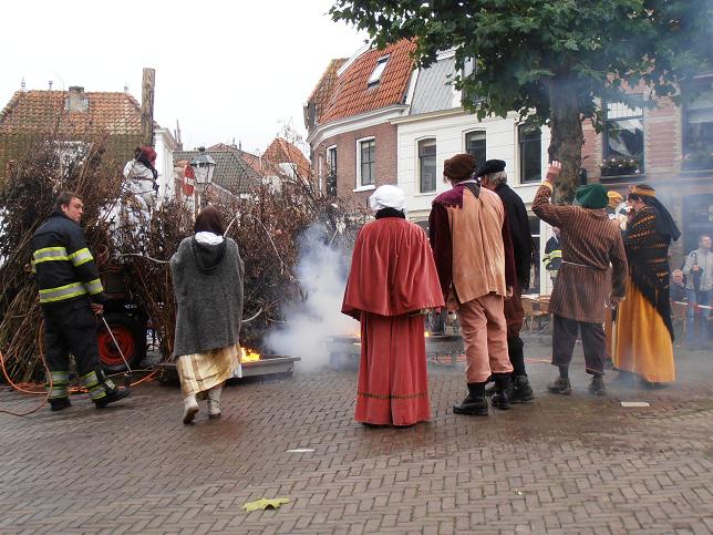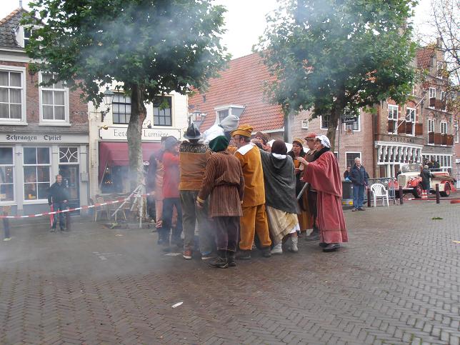 Gekleed in oude kledij uit de tijd van de heksenvervolging kwamen diverse personen luidruchtig de Markt op. Zij trokken een kar voort waarop zij een vrouw vast hielden die zij beschuldigden van hekserij.