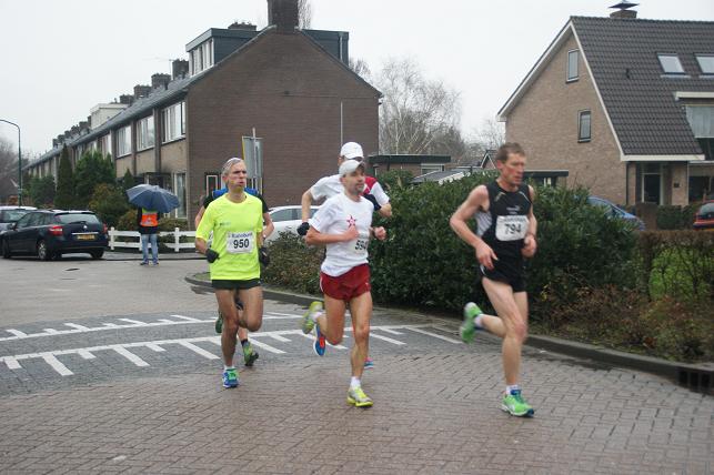 De koplopers tijdens de eerste kilometers van de halve marathon in de G.v.d.Valkboumanstraat in Linschoten.