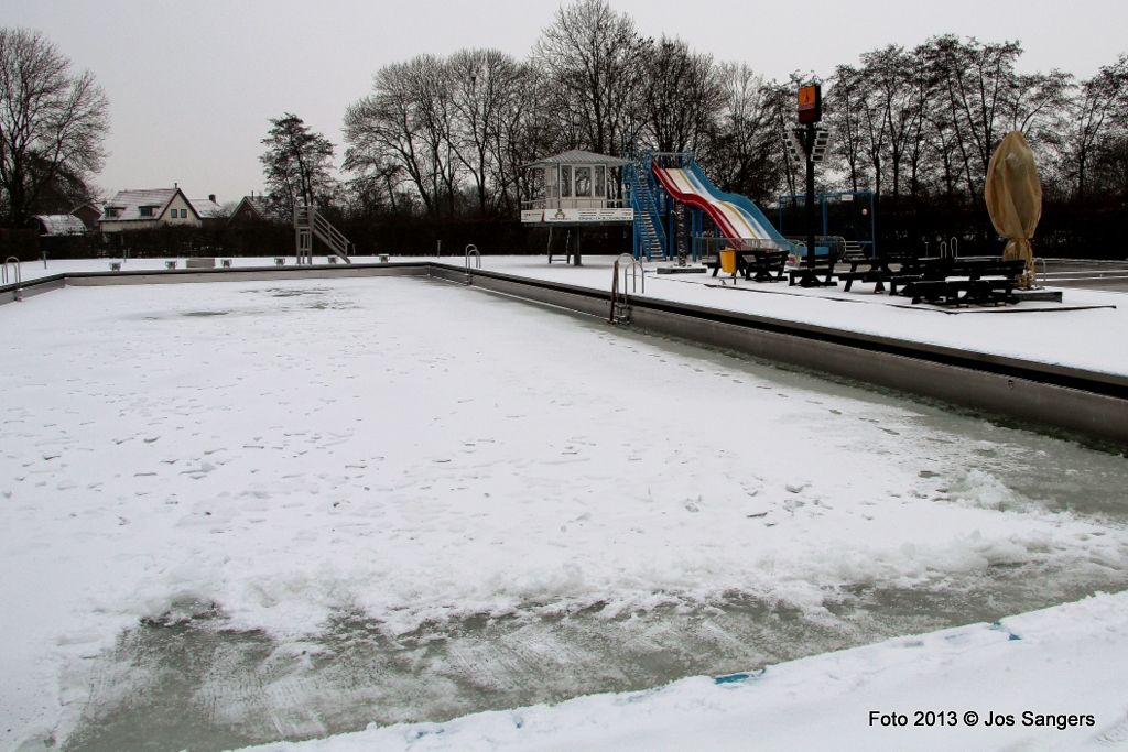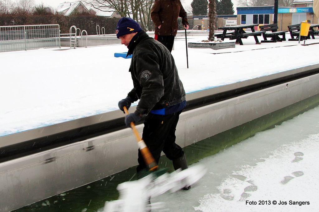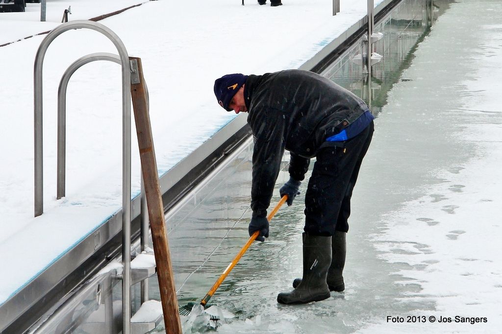 Bij deze lage temperaturen is de beheerder/Badmeester Rene Peters van het Montfoortse Knopenbad iedere dag bezig met het ijsvrijhouden van de roestvrijstalen wanden, dit is noodzakelijk om schade aan de baden te voorkomen.