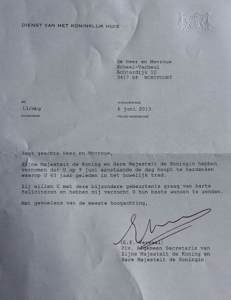 Hetzal zo'n 66 jaar geleden zijn dat de 18 jarige Albert Scheel uitMontfoort en de 17 jarige Lena Verheul uit Willescop elkaarontmoetten op een dansavond in Montfoort. Al snel sloeg de vonk overen het jonge stel besloot na zes jaar verkering te trouwen. De eersteanderhalf jaar van hun huwelijk woonden ze in bij Albert zijn oudersin de Verlengde Hoogstraat. Na de Verlengde Hoogstraat kregen ze eeneigen huis op de Achterdijk waar ze nu alweer ruim 58 jaar wonen. Uithun huwelijk zijn vijf kinderen voortgekomen waarvan twee zonen endrie dochters. Deze kinderen hebben weer gezorgd voor achtkleinkinderen en negen achterkleinkinderen. Albert heeft vele jarengewerkt bij Coöperatie de Vier Gemeente op Willescop en Lena wasdruk met het huishouden. Nadat Albert op zijn 50e werd afgekeurd voorzijn werk vulde hij zijn tijd met biljarten, kaarten koersbal en naarhij zelf zegt, kletsen. Tevens begeleidde hij jarenlang deMontfoortse scootmobielclub op hun vele toertochten door de omgeving.Lena vult veel van haar vrije tijd met dekens maken voor Roemenië.Namens het koninklijk huis werden zij door middel van een brief vanharte gelukgewenst. Zondag negen juni is het jubileum gevierd inzalencentrum St. Joseph. De redactie van Radio Stad Montfoort wensthet paar nog een lang en gelukkig leven toe.