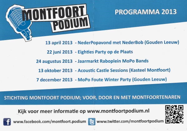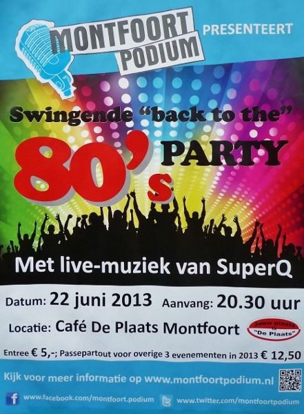 Zaterdagavond 22 juni organiseerde Montfoort podium een gezellige Eighties party in en bij café De Plaats. Nadat het aanvankelijk vrij rustig bleef kwam het publiek zo rond een uur of tien in grote getalen af op de opzwepende en zeer dansbare live muziek van de uit vijf dames bestaande band Super Q . Voor slechts vijf euro entree kon men de hele avond genieten van muziek uit de tachtiger jaren. Tevens konden muziekliefhebbers voor een klein prijsje een passepartout aanschaffen die toegang verleend tot de drie overige evenementen die Montfoort Podium dit jaar nog organiseerd. Deze zaterdagavond kan in ieder geval als zeer geslaagd en voor herhaling vatbaar worden beschouwd.