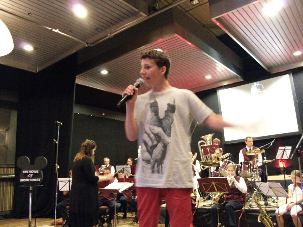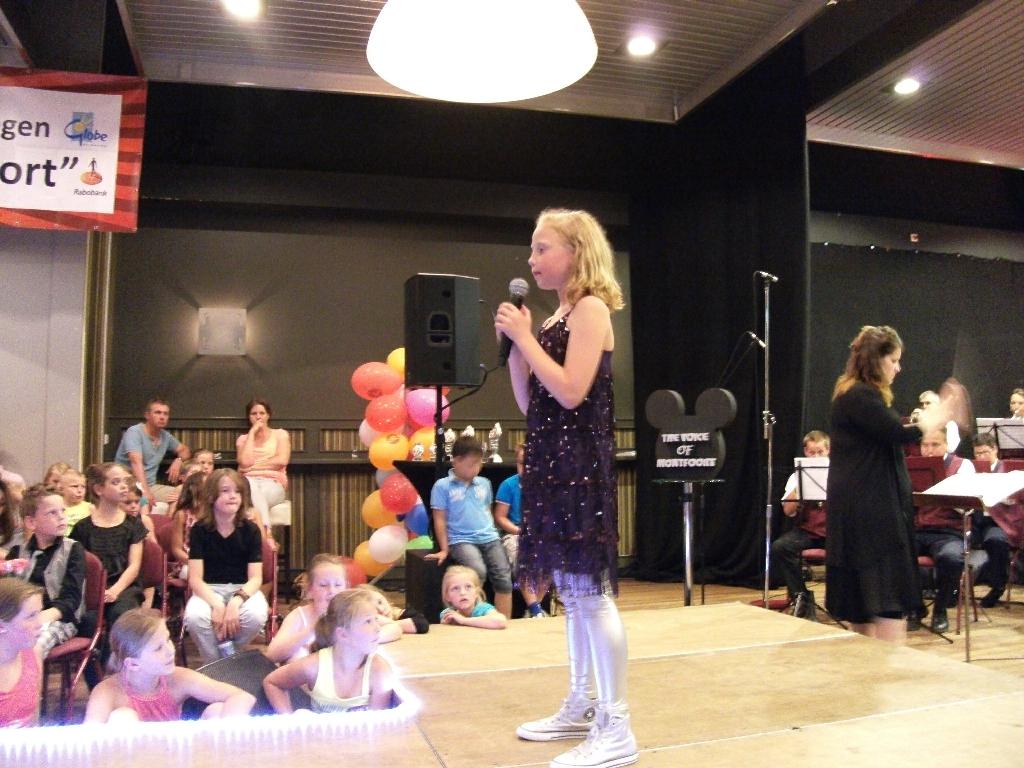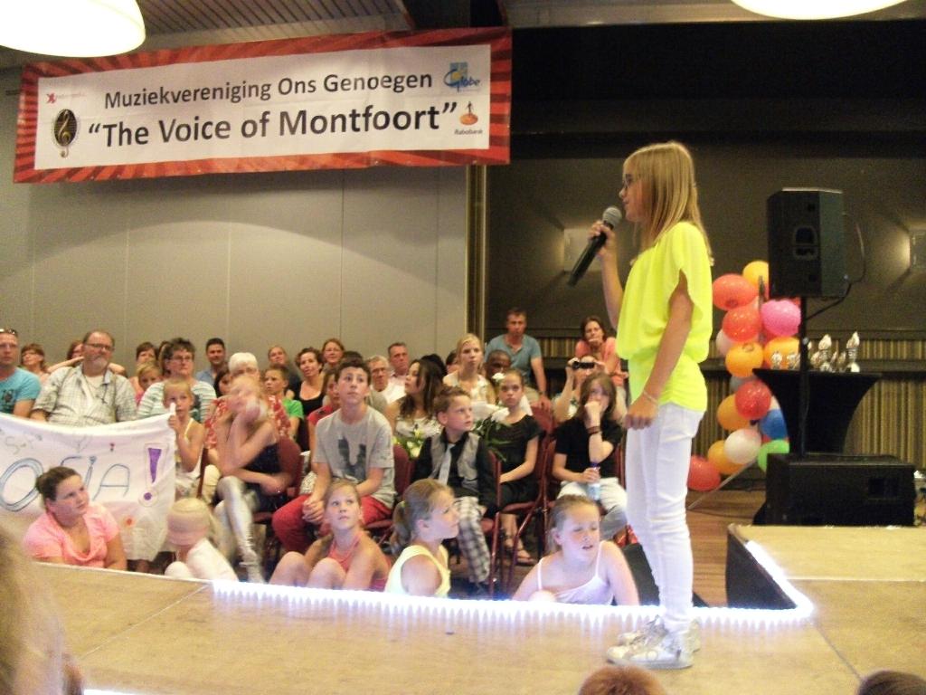 Geplaatst op:07-07-2013 Bijgewerkt op:07-07-2013 16:38 Spetterende finale Voice of MontfoortBron: Nettie Kuijer, redactie Radio Stad MontfoortZaterdag 6 juli streden in het St. Josephgebouw te Montfoort 8 finalisten in “The Voice of Montfoort.” De zangers en zangeressen hadden zich geplaatst via voorrondes op de scholen en in het St. Joseph. Een limousine bracht hen voor de rode loper. Muziekvereniging “Ons Genoegen” zette een daverende show neer, met presentator Michiel de Groot, juryleden Saya Katte, Michiel Roosendaal en Hans Hoogbergen, en natuurlijk de fantastisch presterende deelnemers. Honderden enthousiaste fans, met spandoeken, knuffels en bloemen zweepten de artiesten op tot formidabele prestaties. Het orkest begeleidde hen live, wat voor de zangers best een uitdaging was. Een korte impressie van hun optreden: | Chenna Vianen zong knap, volgens de jury. Ze liep, zoals was gesuggereerd, iets naar voren, en bracht het lied met haar mooie lage stem. | Soukayna Daoudi, zong zuiver, met krachtige stem en had een prima podium presentatie. De zesjarige Niek de Geest, de jongste van het stel, gaf de zaal kippenvel en maakte de jury sprakeloos met zijn uitvoering van “I will allways love you.” Sofia Konincks ontlokte bij het publiek een lang applaus door haar sublieme vertolking van “Samenzijn.” Mara Nulkes hield een sterke voordracht van “Geef mij nu je hand.” Volgens de jury een mooiere vertolking dan van beroepszangers. De energie spatte er vanaf bij Hugo Wagenmakers. Een echte showman met goed podiumgebruik. Julia Looman presenteerde knap, na haar diepe zucht aan het begin. Hylke Sluys pakte met zijn (geschoolde?) stem de toon goed op. En al een echte artiest bedankte hij het orkest. Het was een zinderende finale, en na enig beraad kwam de jury tot de volgende uitslag: 1e Niek de Geest 2e Soukayna Daoudi 3e Mara Nulkes. Naast de eer mogen de drie winnaars respectievelijk naar Disneyland Parijs, de Efteling en Slagharen. Niek krijgt als extra ook nog zangles van Saja Katte.