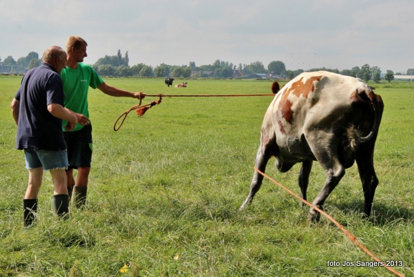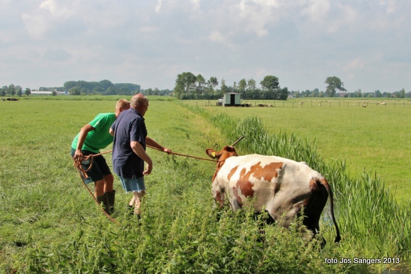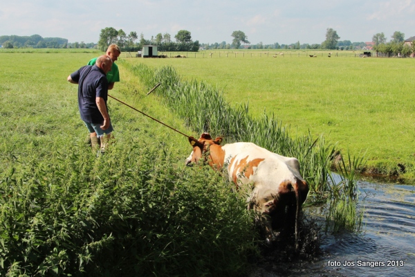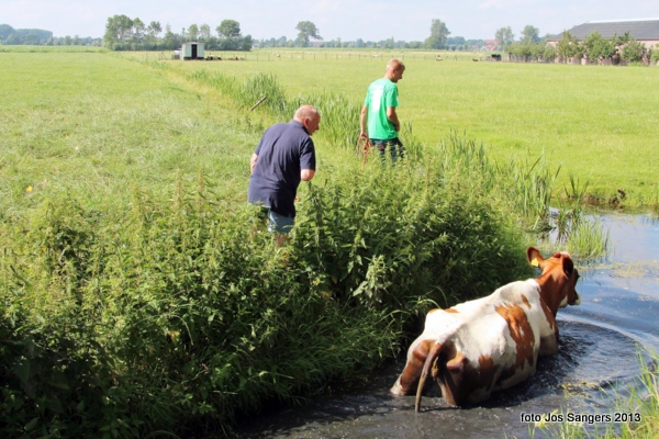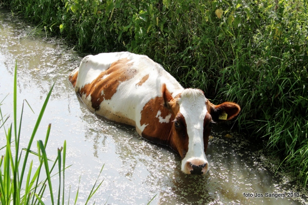 Dat een verslaggever nooit zonder camera op pad kan blijkt vandaag maar weer. Tijdens een fietstocht in Blokland aangekomen, bleek daar een koe de warmte zat te zijn en ook wel eens een verkoelend bad te willen nemen. Rustig stond Berta 3 tot haar kin in een lekker fris slootje te herkauwen. De inmiddels gewaarschuwde boer, die al spoedig kwam, vond het wat lastig om Berta onder water te melken en besloot haar met zachte dwang weer op de vaste wal te helpen. Berta werkte hier gewillig aan mee en huppelde na zo'n drie kwartier weer vrolijk door het weiland.