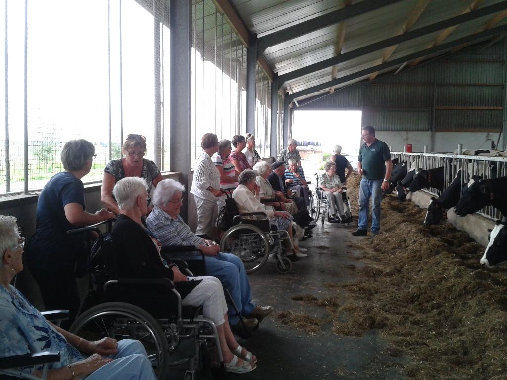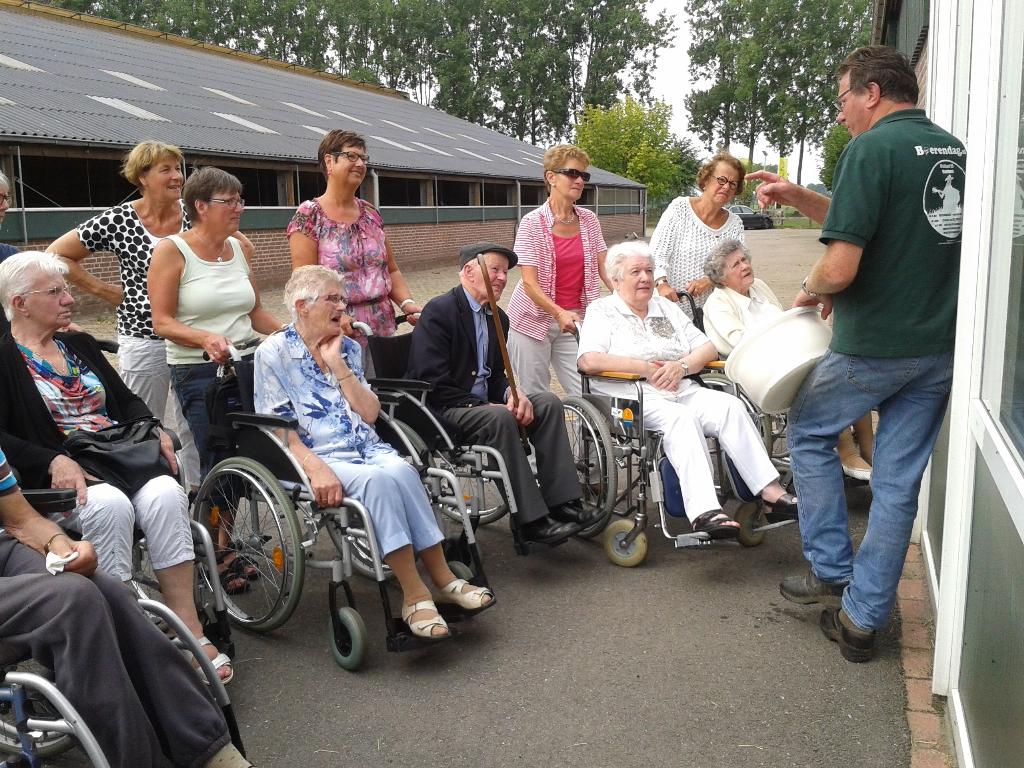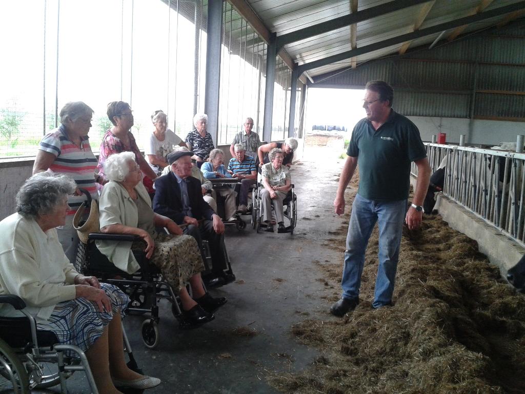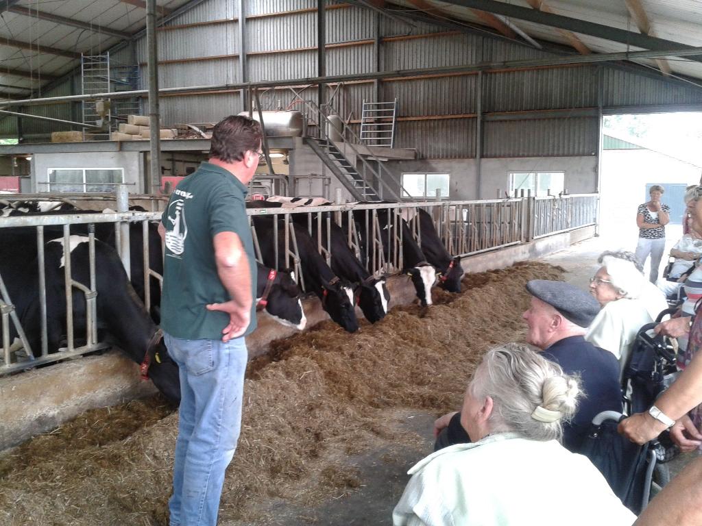Geplaatst op:25-08-2013 Bijgewerkt op:25-08-2013 13:31 Rolstoelwandelaars op pad met de ZonnebloemBron: Leni ScheelWoensdag 21 augustus gingen er weer een stel vrijwilligers van de Zonnebloem met 12 (rolstoel gebonden) oudere medebewoners uit Montfoort aan de wandel. Deze keer ging de wandeling naar Blokland, waar zij allen zeer gastvrij ontvangen werden op de zuivelboerderij van de familie Vlooswijk. Ad en Ans heetten alle gasten hartelijk welkom, en kreeg een ieder koffie of thee met een plakje koek met roomboter. Daarna kregen ze een rondleiding met uitleg over het bedrijf. Met veel belangstelling werd er goed geluisterd naar Ad , die met heel veel plezier en gedrevenheid over het bedrijf vertelde. Daarna was er voor een ieder nog een glaasje sap met een lekker stukje kaas. Mede door het goede weer, weer een zeer geslaagde middag