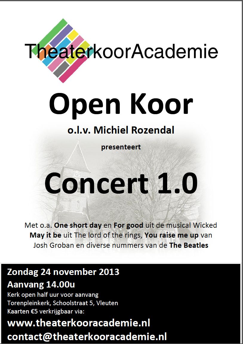 Wie een ander concert van de TheaterkoorAcademie wil gaan beluisteren is op zondag 24 november wederom welkom in de Torenpleinkerk in Vleuten voor het Concert 1.0 van het Open Koor Project. Kaarten zijn te bestellen via www.theaterkooracademie.nl of voor degenen die niet via internet bestellen telefonisch op 0348-472365.