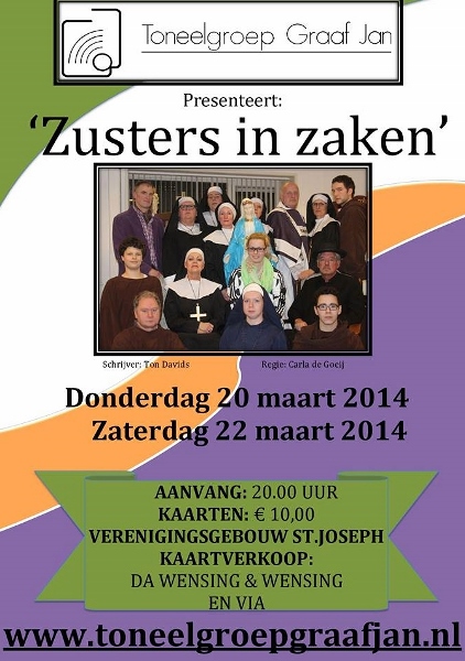 Donderdag 20 en zaterdag 22 maart presenteert toneelgroep Graaf Jan de toneelvoorstelling Zusters in Zaken in het verenigingsgebouw St. Joseph in Montfoort. De avond begint om 20.00 uur, de zaal is open om 19.30. Kaarten zijn in de voorverkoop verkrijgbaar bij D.A. Wensing & Wensing of op beide avonden aan de kassa.