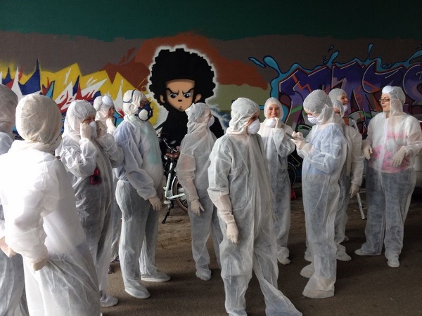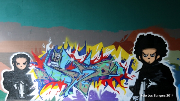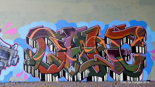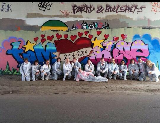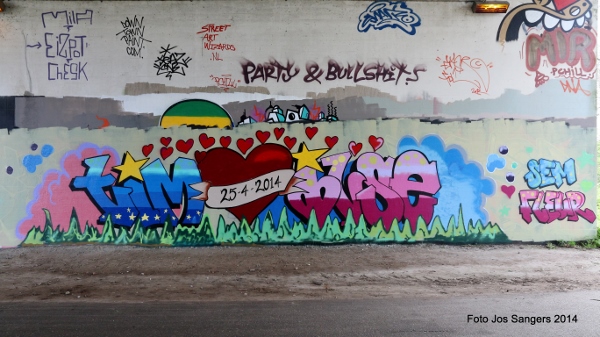 | Dat de meeste mensen een hekel hebben aan graffiti is wel duidelijk. Maar dat graffiti ook mooi kan zijn bewijzen wel de onderstaande foto's die zijn gemaakt op een viaductwand zo halverwege Woerden en Driebruggen. De, in het verleden in Montfoort wonende Gonnie Vlooswijk (dochter van RSM medewerker Bart en zijn vrouw Corry), besloot samen met 13 vriendinnen op een vrijgezellendag voor aanstaande bruid Ilse een mooie muurschildering te maken op de wand van bovenstaand viaduct. Dat het een waar kunstwerk is geworden bewijst onderstaande foto. Na eerst netjes toestemming te hebben gevraagd bij de Woerdense organisatie Street Art and Graffiti, konden de dames hun gang gaan. Nadat eerst het silhouet getekend was konden de vriendinnen inclusief de bruid, beschermd door overals en voorzien van mondkapjes, de zaak met spuitbussen gaan invullen. Naar verluidt zijn aanstaande bruid en bruidegom erg blij met het mooie resultaat. Wie zelf het kunstwerk in het echt wil bewonderen: fiets vanaf het viaduct tussen Woerden en Linschoten over de parallelweg langs de A 12 richting Den Haag, na zo'n 15 minuten fietsen bereikt u het viaduct onder de snelweg waar meerdere mooie schilderingen zijn te zien. |