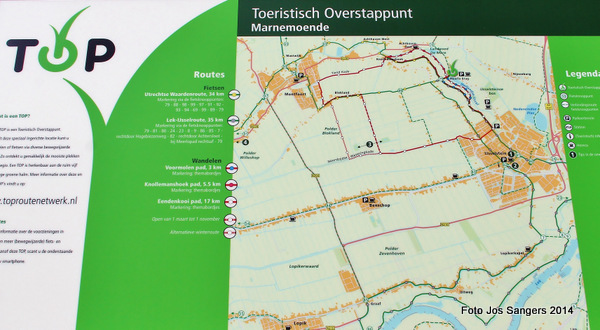 | Vandaag vrijdag 9 mei is bij jachthaven Marnemoende tussen Montfoort en IJsselstein een nieuw toeristisch overstappunt geopend: TOP Marnemoende. Na een openingswoord door de voorzitter gebiedscomissie Utrecht west, Jaap Verkroost, namen ANWB voorzitter Guido van Woerkom en gedeputeerde van de provincie Utrecht, Ralph de Vries het woord. Het slotwoord werd uitgesproken door Marnemoende eigenaar Jan Kromwijk. Na deze plechtigheden volgde de officiële opening van het startpunt van de route. De vier bovenstaande heren verrichtten de openinghandeling vanuit een, voor deze gelegenheid op een oplegger geplaatste, sloep. Een TOP is een startpunt waar recreanten de auto kunnen parkeren om van daaruit heerlijk te fietsen of te wandelen. De TOP locaties zijn te herkennen aan de markante, stalen groene grashalm van ruim vijf meter hoog. Dit jaar komen er nog zeker twee TOPs bij, namelijk één bij Vinkeveen Haven en de andere bij Salmsteke te Lopik. Het totaal van het aantal TOPs in de provincies Utrecht, Zuid- Holland en Noord-Brabant is inmiddels uitgebreid tot 36. |