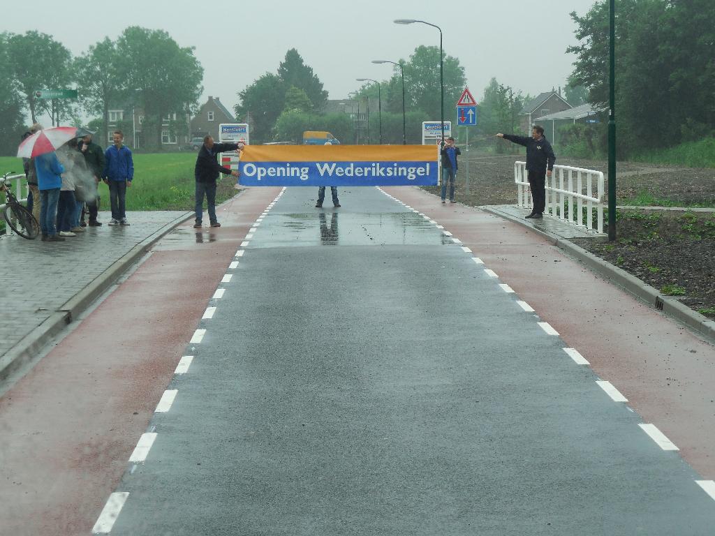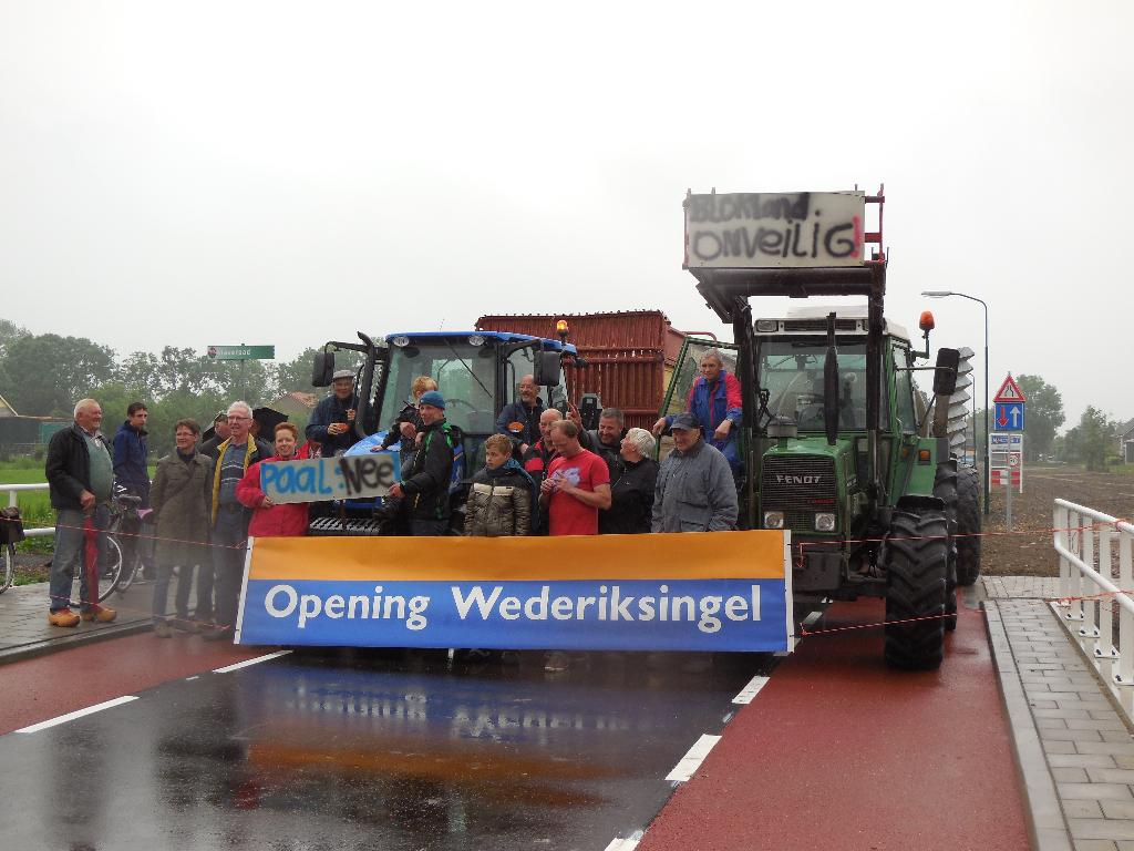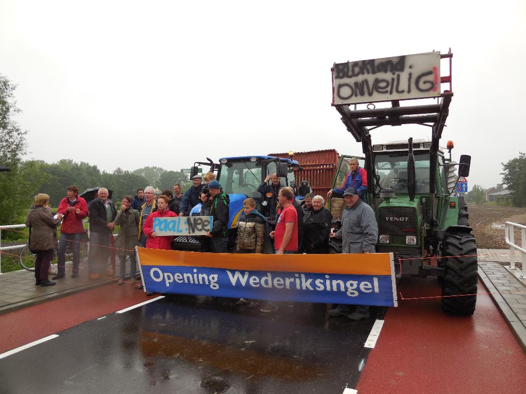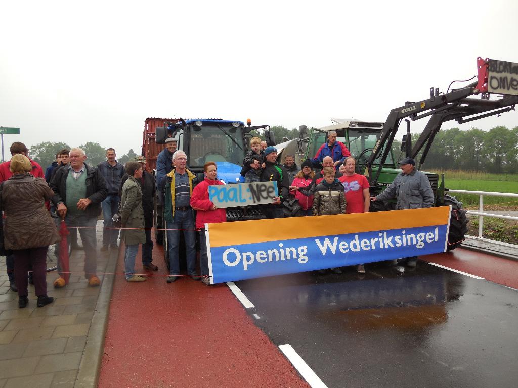 Geplaatst op:28-05-2014 Bijgewerkt op:28-05-2014 19:18 Wederiksingel officieel geopendBron: redactie RSM Aad van der VeenOp 28 mei werd onder grote belangstelling de nieuwe ontsluitingsweg van Montfoort, de Wederiksingel geopend. Deze belangstelling was vooral een protestactie van de agrariërs en bewoners van Blokland. Zij maken namelijk een groot bezwaar van het feit dat gelijktijdig met deze opening, zowel de Bovenkerkweg maar vooral de Benedenkerkweg wordt afgesloten voor gemotoriseerd verkeer d.m.v. een paaltje bij de Bleek. Over deze afsluiting was namelijk helemaal niet gecommuniceerd. Zij hadden daarom de Wederiksingel met veel tractoren en overige voertuigen gebarricadeerd. Om nu de opening toch ordentelijk te kunnen laten verlopen, ging burgemeester Jansen samen met de actievoerders de bus in, om tot een gesprek te komen. Hierbij was de pers niet aanwezig, vooral om de gemoederen tot bedaren te brengen. Ondertussen gaf wethouder Jonkers een korte verklaring. Hij deelde mee dat alles in overleg met de LTO was gebeurt en dat voor de agrariërs er de mogelijkheid is om bij langdurig en intensief gebruik van de Benedenkerkweg er één sleutel beschikbaar is op de paal te verwijderen. Hierna kwam burgemeester Jansen uit de bus met de mededeling dat het paaltje op de Bleek pas wordt geplaatst, nadat de bezwaarmakers een gesprek hebben gehad met wethouder Jonkers. Dit tot tevredenheid van de actievoerders, die daarop besloten in een protesttocht door de naastgelegen woonwijk terug naar huis te gaan. Hierna kon alsnog door de burgemeester de opening worden verricht met een welkom aan de aanwezigen. Hij sprak zijn waardering uit voor de realisatie van deze weg en vond het een aanwinst voor zowel de jongste woonwijk van Montfoort als de overgang naar het groene achterland, wat dienst als een recreatieplek voor veel jonge gezinnen in de wijk. Hij spreekt ook woorden van dank aan de firma Jos Scholman voor de bijzonder prettige samenwerking, waarop de heer Scholman in zijn dankwoord ook sprak over de trots van zijn bedrijf om deze nieuwe weg te hebben gerealiseerd. Hierna konden het college en overige belangstellenden in de bus, om op een symbolische wijze met de bus de Wederiksingel voor geopend te verklaren.