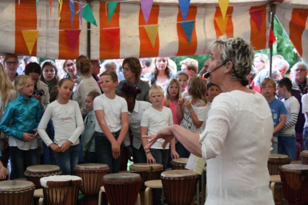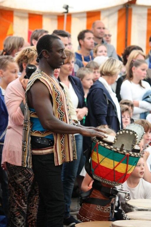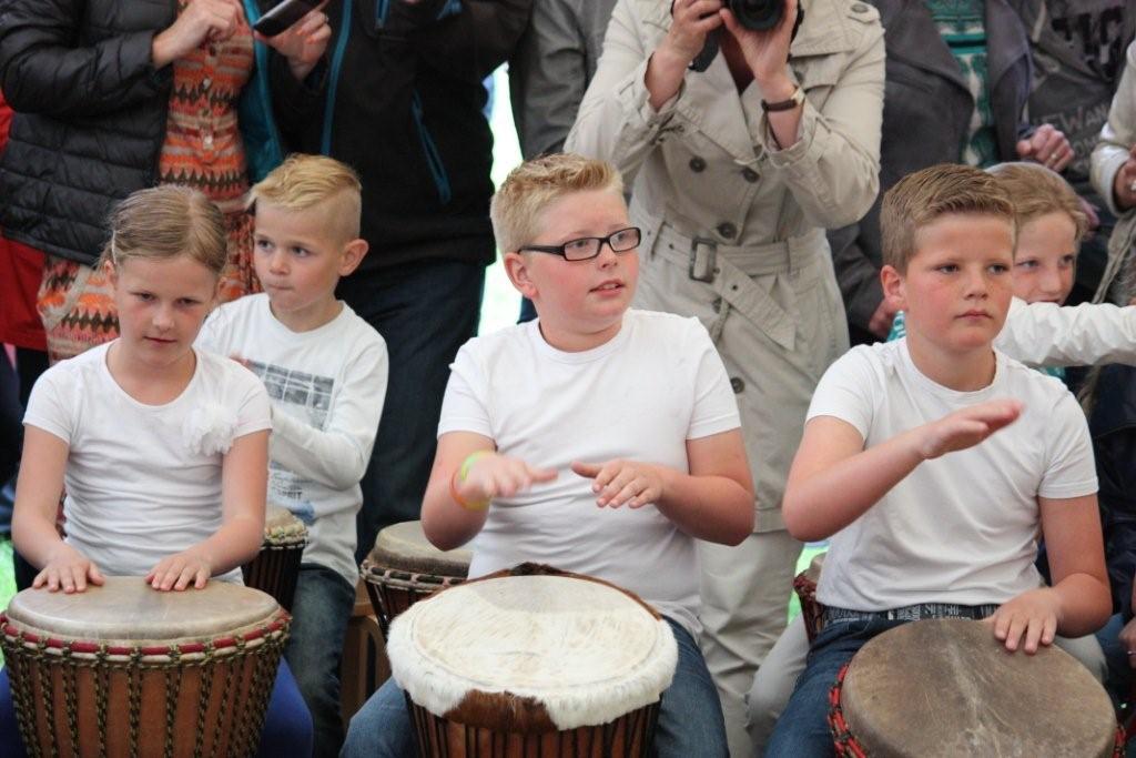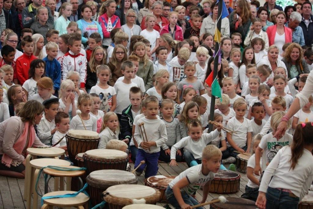 Geplaatst op:30-05-2014 Bijgewerkt op:30-05-2014 14:28 Een geweldig muzikale traktatie van de Howiblo - leerlingen!Bron: Frans van VlietOp maandag en dinsdag 26 en 27 mei trakteerden alle groepen van KBs De Howiblo hun ouders, opa’s en oma’s en andere muziekliefhebbers op een spetterende Djembé-voorstelling in de gratis aangeboden tent van STAM (Stichting Tent Activiteiten Montfoort) in het Stadspark. Ieder jaar zorgt de Kunst- en Cultuurcommissie van de school in het kader van kunst- en cultuureducatie voor een programma voor alle groepen van de school. Het ene jaar gaan alle groepen van kleuter tot groep 8 leerling naar een passend museum, het jaar erop komt een bepaalde discipline naar de school. Ook dit jaar maakte de Oudervereniging van de school het weer financieel mogelijk om een prachtig evenement neer te zetten. Gedurende twee dagen werd er in workshop – vorm groepsgewijs naar hartenlust getrommeld onder de bijzonder bezielende leiding van Corien Koning en inval trommelaars Nick en Mister Oké uit Senegal, die de zieke Nel Schippers voortreffelijk vervingen. De Djembé – groep Agogo kwam uit Veldhoven naar Montfoort om met hulp van enkele muzikale ouders als begeleidingsgroep trommelaars het uiterste aan muzikaliteit uit de kinderen te halen, zodat er ’s avonds een top optreden kon worden gehouden! Dankzij de inzet van veel vrijwillige ouders kan de school op twee fantastisch dagen en avonden terugkijken, waar nog lang over werd nagesproken in Montfoort.