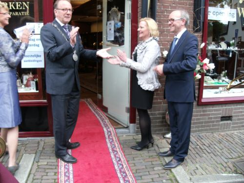 Geplaatst op:20-06-2014 Bijgewerkt op:20-06-2014 20:09 Hoera, na 14 jaar weer terug in Montfoort!Bron: Nettie Kuijer, redactie Radio Stad MontfoortVrijdag 20 juni 2014 fietste de stadsomroeper door Montfoort en schalde het nieuws rond: “De juwelierswinkel van Els en Cor Wiegand Bruss wordt vanavond om 7 uur officieel geopend.” Fanfareorkest “Ons genoegen” marcheerden door de oude binnenstad en lokte de inwoners naar de opening. Burgemeester Bert Jansen heette het echtpaar Wiegand Bruss welkom thuis. “De klanten van Cor hoeven nu niet meer naar zijn zaak in Utrecht, ze waren hem al die jaren van afwezigheid trouw gebleven.” Schildersbedrijf Vianen, bloemsierkunst Henny Voorhout, de carnavalswinkel en nu een juwelier. De winkeliers die huisden in het karakteristieke pand hebben altijd kleur en sfeer geboden. De oude houten vloer van de bloemenwinkel is geschuurd en gebeitst. Glanzende vitrines bevatten o.a. met de hand gemaakte Solokov sierraden uit Rusland. Verbluffend mooi. Cor vertelde dat zijn vrouw Els en hij op zoek waren naar een “thuis” in Montfoort. “We zijn zo blij met dit pand, het is ideaal, hier kunnen we wonen en werken, hier wil ik oud worden.” Het is een aanrader om eens binnen te lopen tijdens de openingsmaand van 20 juni tot 20 juli.
